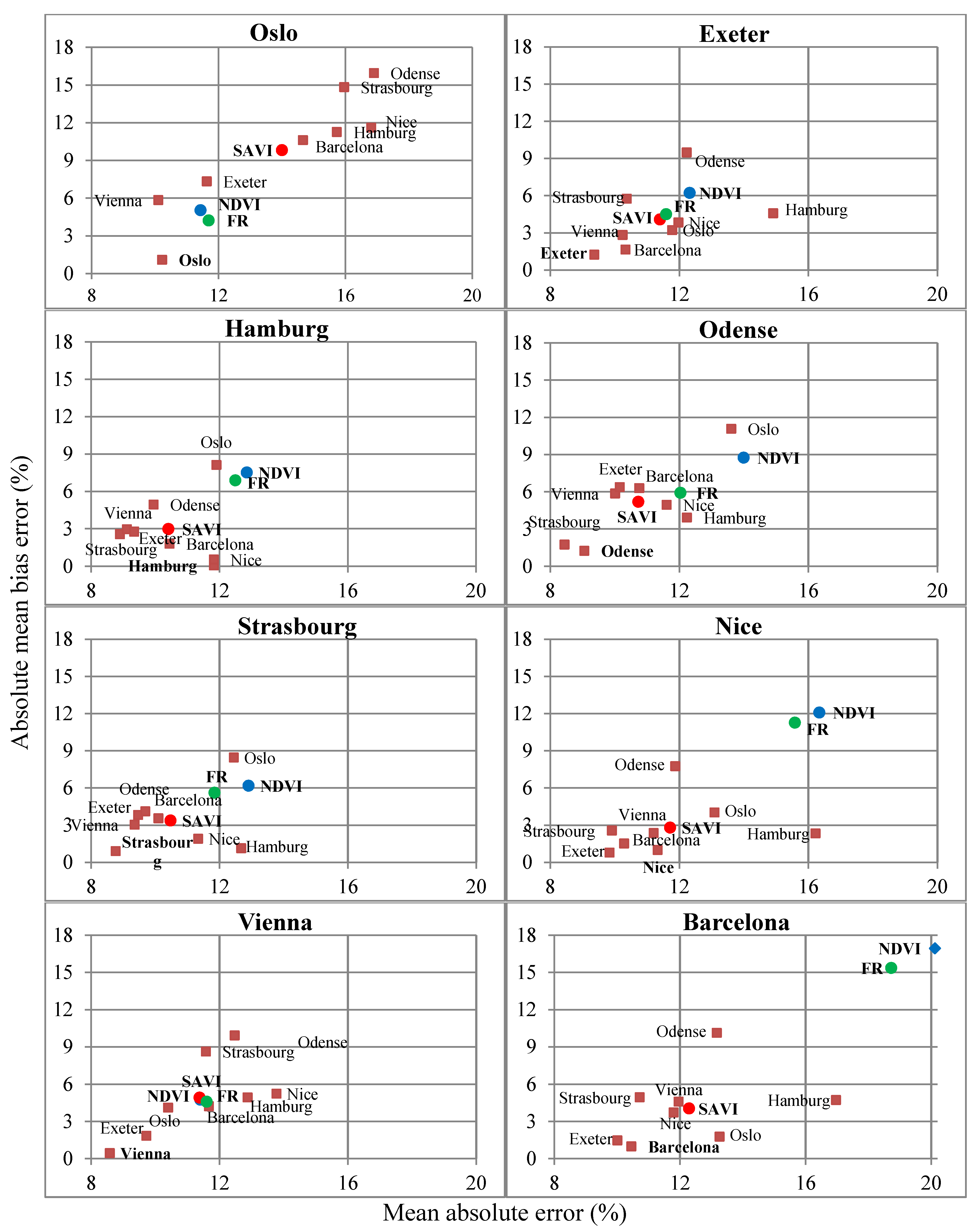 The performance of the linear and polynomial regression models is evaluated by calculating the Mean Absolute Errors (MAE) and the Mean Bias Errors (MBE) of the VI based IS estimates as compared to the reference IS fractions (Figure 3D) (Equations (5) and (6)). To evaluate the spatial transferability of the regression models, we specifically estimate the loss of accuracy when using a transferred model (e.g., a model developed for another city) as compared to a local model. (Figure 3E). This is done by quantifying the MAEs and MBEs for all possible combinations of IS models and urban sub-areas. Also, regional regression models are developed by aggregating NDVI/SAVI and reference IS data from the cities located within the same terrestrial ecoregions (Figure 1). The accuracies of three different regional regression models are examined for both NDVI and SAVI, namely aEuropean model (all cities), a Central model (Odense, Hamburg, Exeter, Strasbourg and Vienna) and a Southern model (Nice and Barcelona).