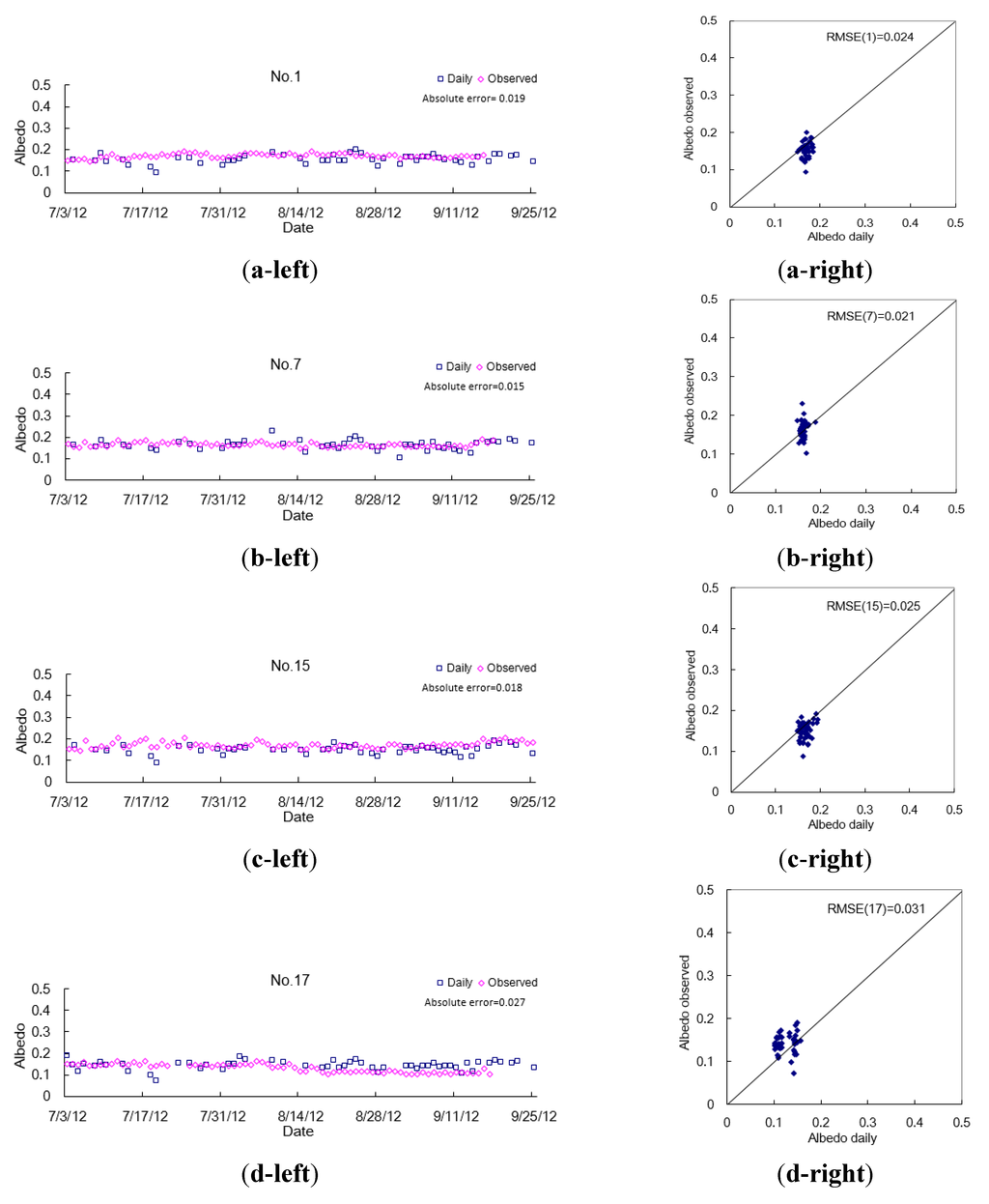 To demonstrate further the good temporal characteristics of the derived daily albedo, the number of time series of the derived daily 30-m albedo and of HJ-1A/B albedo retrieved using Shuai’s method from 1 July to 30 September 2012 at six sites are extracted (Table 5). Deleting singular values caused by cloud or other reasons, the temporal series of the derived albedo has more virtual values than the HJ-1A/B albedo retrieved using Shuai’s method. This demonstrates that the proposed method is able to derive albedo data with a higher temporal resolution than other currently used methods (Shuai’s work and Franch’s work).