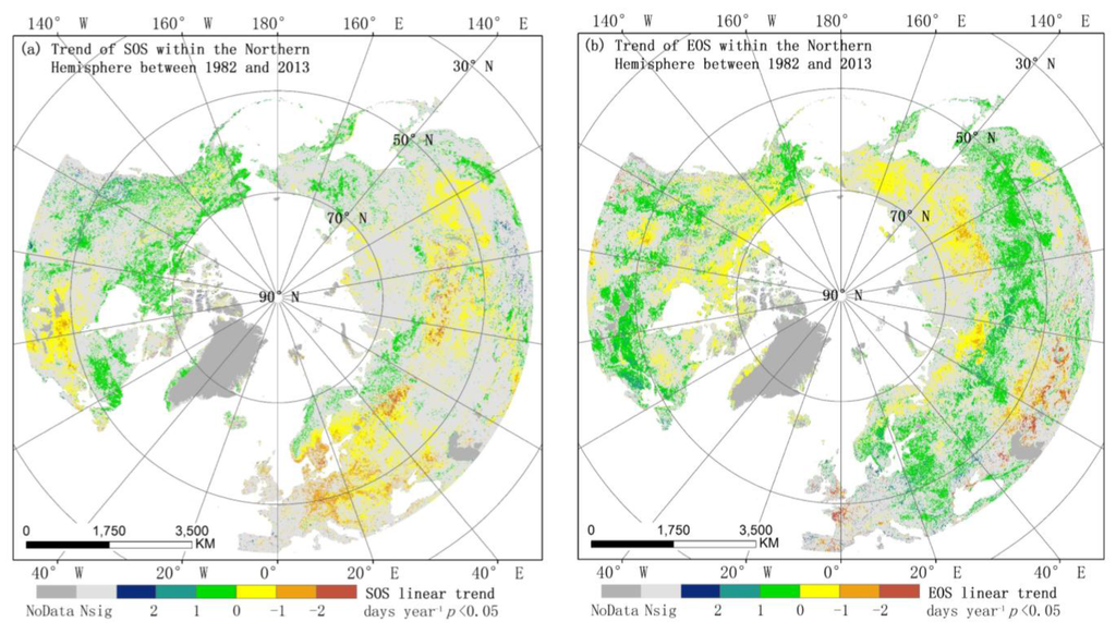 However, vegetation phenological trends are significantly reduced after 2000 compared with before 1999. Jeong et al. [26] reported that the SOS was advanced by 0.18 days, the EOS was delayed by 2.3 days, and the LOS was extended by 2.5 days from 2000 to 2008. A study by Zeng [6] showed that the SOS was advanced by 0.2, 0.3, and 0.1 days·decade−1 in the Arctic, Eurasia, and North America, respectively, from 2000–2008. Moreover, Wang et al. [27] found a reduction in the trend of advancing SOS and noted that it was delayed in the Northern Hemisphere (30°N–75°N) after 2000.