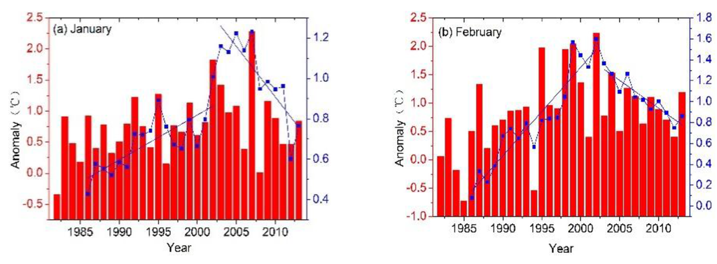 To further analyze whether the temperature change had an impact on vegetation phenology changes, the Northern Hemisphere land temperature anomalies data from 1880 to 2014 were download from NOAA's National Centers [33]. The term temperature anomaly means a departure from a reference value or long-term average. A positive anomaly indicates that the observed temperature was warmer than the reference value, while a negative anomaly indicates that the observed temperature was cooler than the reference value [34]. In this paper, we used temperature anomalies from 1982 to 2013 for our analysis.