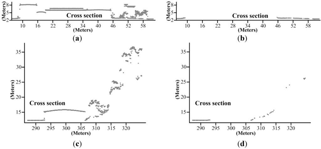 Generally, objects can be filtered out because they are discontinuous from the bare ground. However, breaklines on the bare ground are an exception to this assertion [2]. These discontinuities should be preserved for high-quality DTM generation. These kinds of discontinuity are not continuous in the 2D view (Figures 12a,b), but they may be continuous from some directions in 1D view (Figure 12c). Since the cost function of SGF is optimized from eight directions, the final classification surface is selected by the information provided from all these directions. This case implies that the breaklines may not be detected from one direction (Figure 12a), but they can be detected from other directions (Figure 12c). The results are presented in Figure 12.
