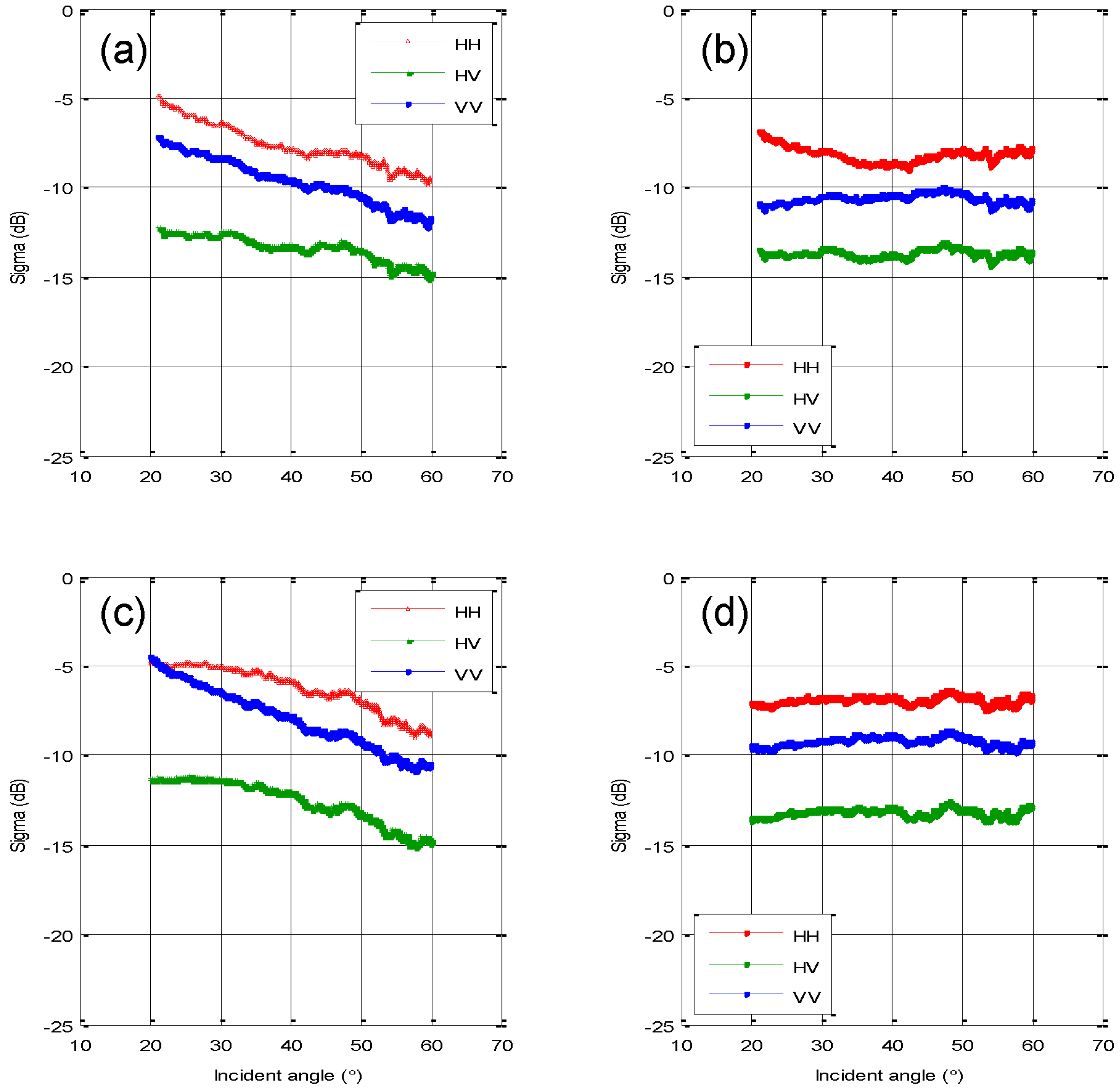 - Menges, C.; van Zyl, J.; Hill, G.; Ahmad, W. A procedure for the correction of the effect of variation in incidence angle on AIRSAR data. Int. J. Remote Sens. 2001, 22, 829–841. [Google Scholar] [CrossRef]