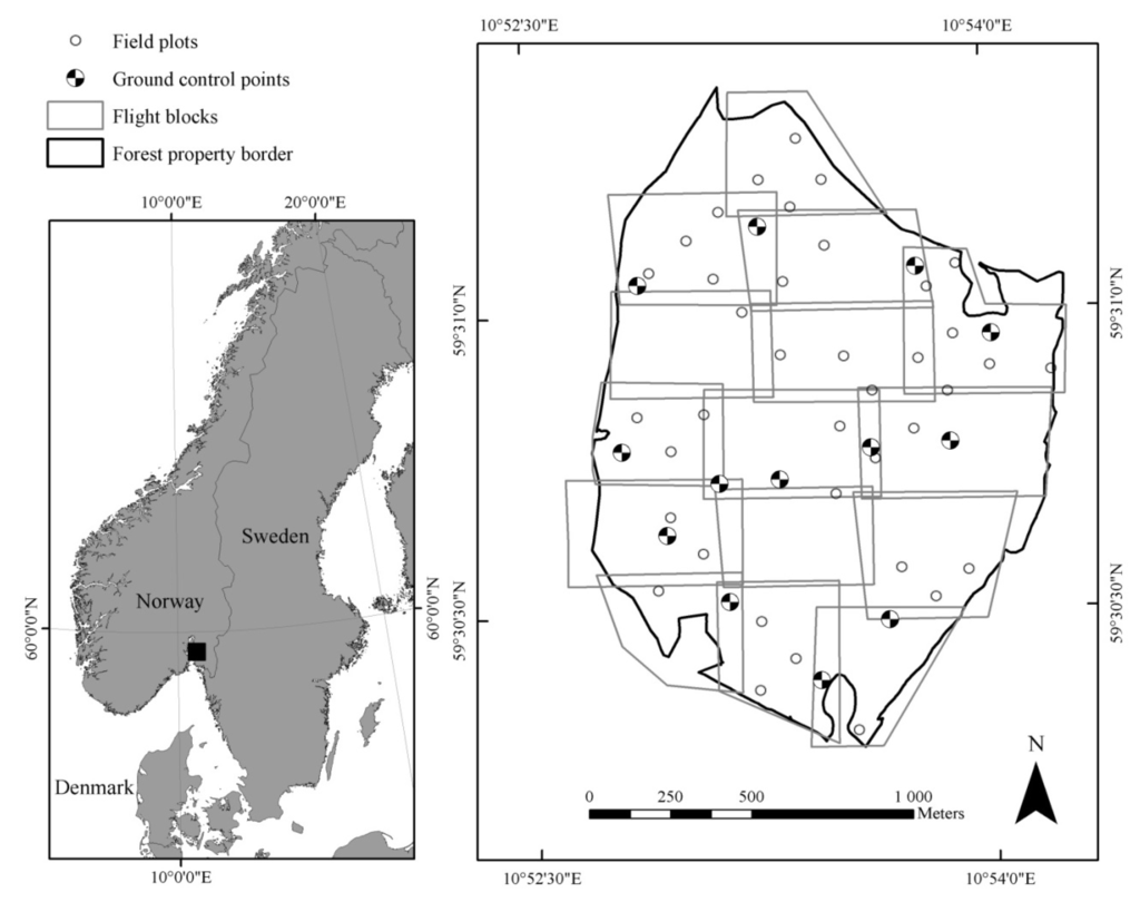 The study was conducted in a 194.7-ha boreal forest area in Våler municipality (59°30′N, 10°55′E, 70–120 m above sea level) located in south-eastern Norway (Figure 1). The area is part of a larger forest area (852.6 ha) inventoried using ALS in 1999 and 2010. The smaller area was selected as it constituted a single private property and was therefore an example of a medium- to small-sized forest property in Norway for which UAS may be effectively used for forest inventory purposes. The dominant tree species is Norway spruce (Picea abies (L.) Karst.), followed by Scots pine (Pinus sylvestris L.), and deciduous trees dominated by birch (Betula pubescens Ehrh.). The percentage of each species in terms of basal area is 52%, 37%, and 11% for spruce, pine, and deciduous trees, respectively. The forest is mainly managed for timber production. Silvicultural treatments are carried out according to established best practices in boreal forests in Norway. These include clear-felling and shelterwood cutting systems depending on the site productivity. On more fertile sites, clear cutting is usually applied followed by planting, whereas in pine-dominated stands on poorer sites, the shelterwood cut system is preferred in combination with planting or natural regeneration.