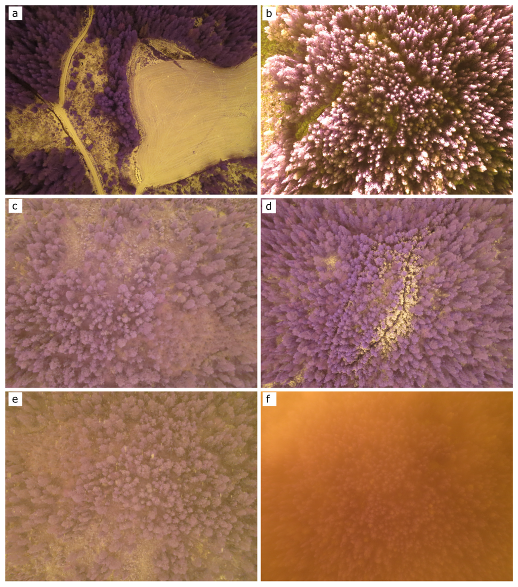 Factors affecting image quality. In general, is possible to see that the imagery was characterized by large perspective distortions and different light and atmospheric conditions in different flights. In particular: (a) saturation due to the high scene contrast causing the forest to look dark; (b) during the sunny flight, the tree tops were saturated due to illumination of only the tree tops enhanced by the low sun angle; (c) blurriness caused by high wind speed (7 m∙sec−1); (d) presence of snow on some parts of the canopy causing these parts to have an anomalous spectral response with regard to the object represented; (e) presence of snowflakes in the images due to precipitation during image acquisition; (f) presence of fog during image acquisition, which reduced the visibility and sharpness of the image.