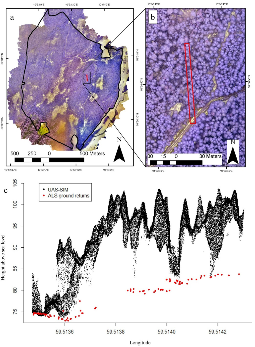 Overview of the data used in the study. (a) Orthophoto mosaic of the total inventory area shown only for visualization purposes; (b) detail of the orthophoto mosaic showing the high resolution of the imagery, including the transect; (c) transect showing the vertical distribution of the UAS-SfM point cloud (in black) and the corresponding ALS ground returns (in red).