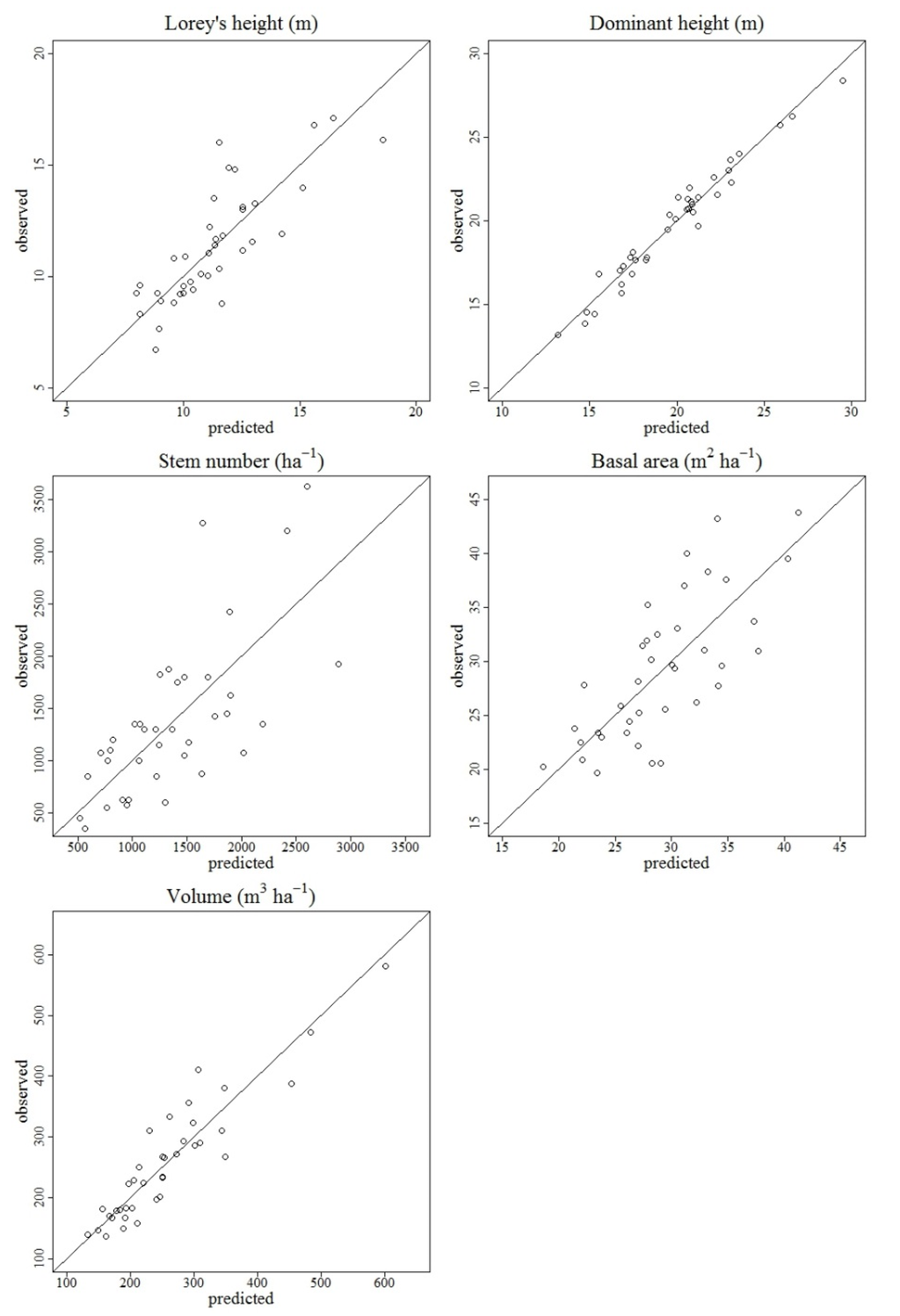 The results of the current study demonstrated that except for N and G, the fitted models showed a rather good fit with an adj. R2 that was consistently higher than 0.71. The cross-validated predictions at the plot level also proved the models to be reasonably accurate in terms of RMSE (i.e., relative RMSE ≤ 15.4%) except for N (i.e., relative RMSE: 39.2%). For all of the models, the mean differences between the predicted values and the field data were consistently small, with an absolute relative value that was smaller than 0.36%. The hdom model yielded the most accurate predictions, followed by the hL, V, G, and N models. The analysis of the residuals revealed no serious violation of the model assumptions. As previous studies have demonstrated, the stem number models were affected by larger errors, and N was underestimated in plots with very dense forest. Due to the lack of stand reference data, no independent validation was carried out. Nevertheless, an improvement in accuracy can be expected when predicting at a stand level due to the averaging of the predictions over several prediction units or grid cells [57].