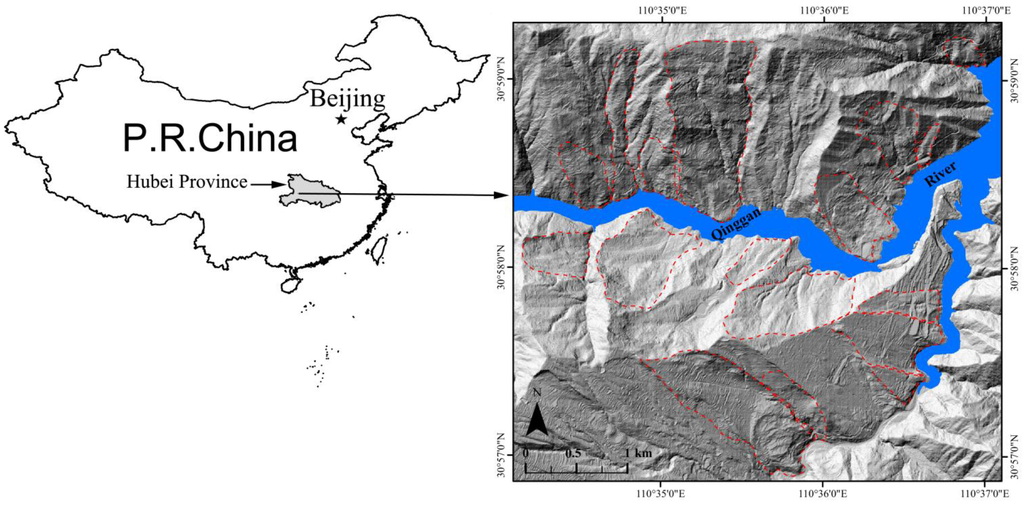 The study covered a 21.6 km2 landslide-prone area around the town of Shazhenxi in Zigui County, and a section of the Qinggan River, which is a major branch of the Yangtze River (Figure 1). Landslides greatly affect the study area, and the referenced landslide inventory map resulted from collected landslide inventory data, extensive fieldwork, and visual interpretation of aerial images [55] and LiDar-derived topographic data [42].