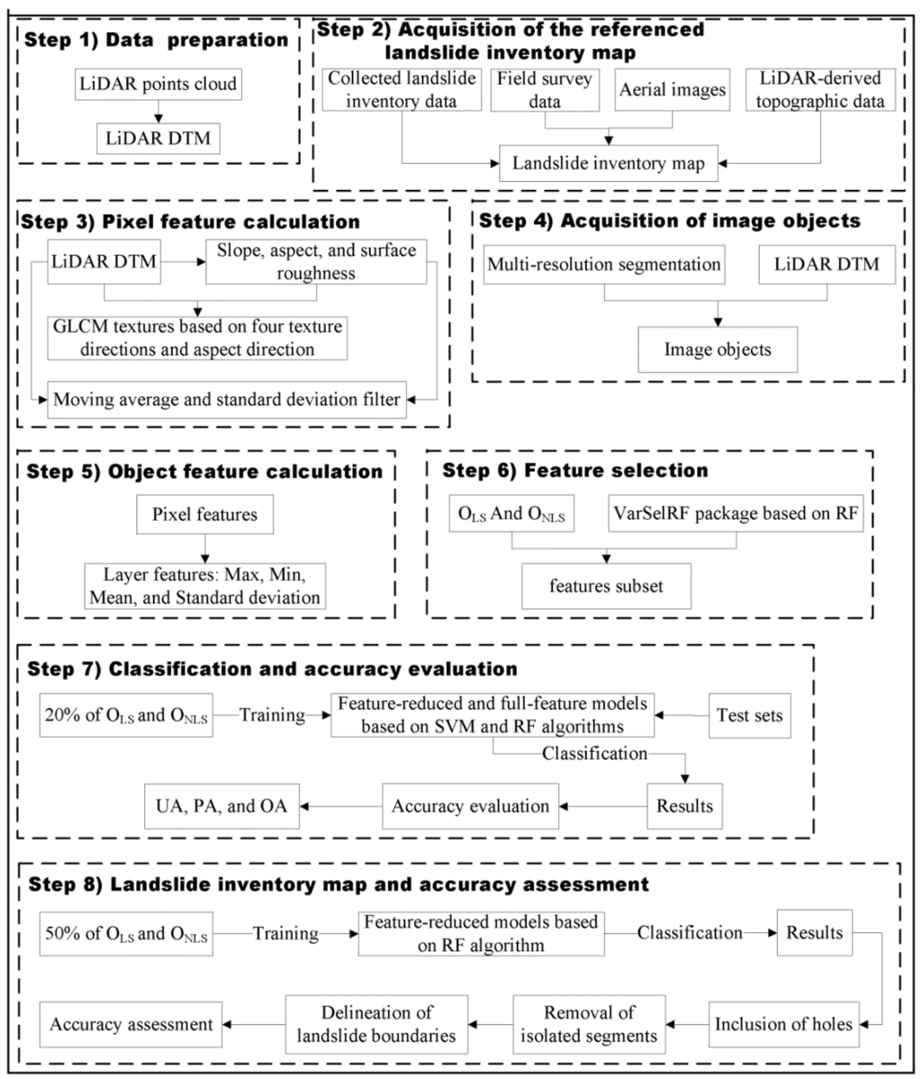The landslide inventory map of the study area was completed using the collected landslide inventory data, extensive fieldwork, and visual interpretation of aerial images and LiDar-derived topographic data. A series of pixel features, primarily pixel-based landslide influential factors [56], were calculated from LiDar-derived DTM data. Image objects were structured from DTM images using multiresolution segmentation (MRS), and object features were extracted. The objects were then labeled as landslide (OLS) and non-landslide objects (ONLS) [28]. Objects that contained more than 50% landslide pixels were classified as OLS, and others as ONLS [28]. A wrapper feature selection method based on the RF algorithm, which utilizes the classifier as a black box to score the subsets of features based on their predictive power [57], was chosen and applied in order to reduce the dataset size. RF and SVM models were then applied to classify landslide and non-landslide objects, and the classification accuracies were assessed. Based on the classification result, the landslide inventory was finally obtained according to the following: (1) inclusion of holes surrounded by the landslide body, (2) removal of isolated and small segments that are located away from rivers and landslide bodies, and (3) delineation of closed envelope curves for OLS by manual digitizing operation. The flowchart for this process is presented in Figure 2.