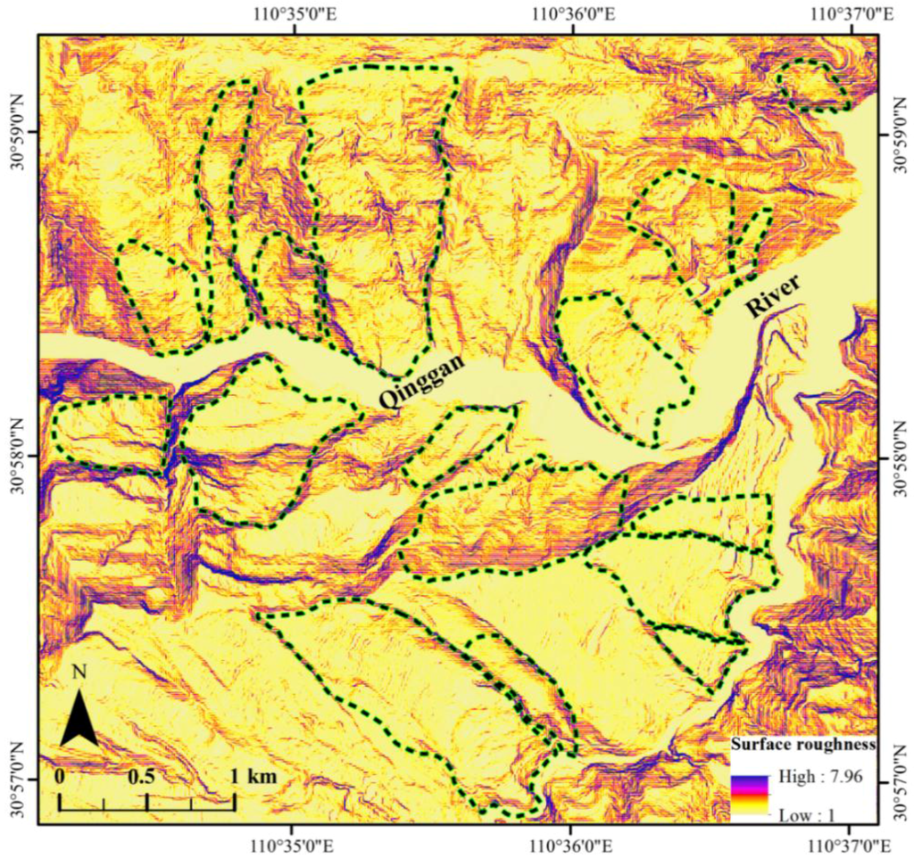 Surface roughness image and landslide locations. Black dots with green boundaries represent the landslide boundaries.