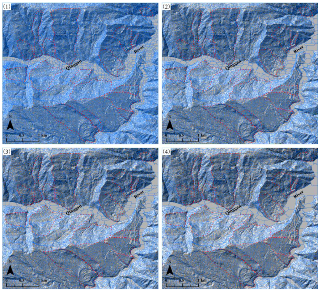 Overlay display of image segmentation results on landslide boundaries and shaded relief images at the scales of: (1) 10, (2) 20, (3) 30, and (4) 40. Blue solid lines represent the segmentation results, and red dotted lines represent landslide boundaries.