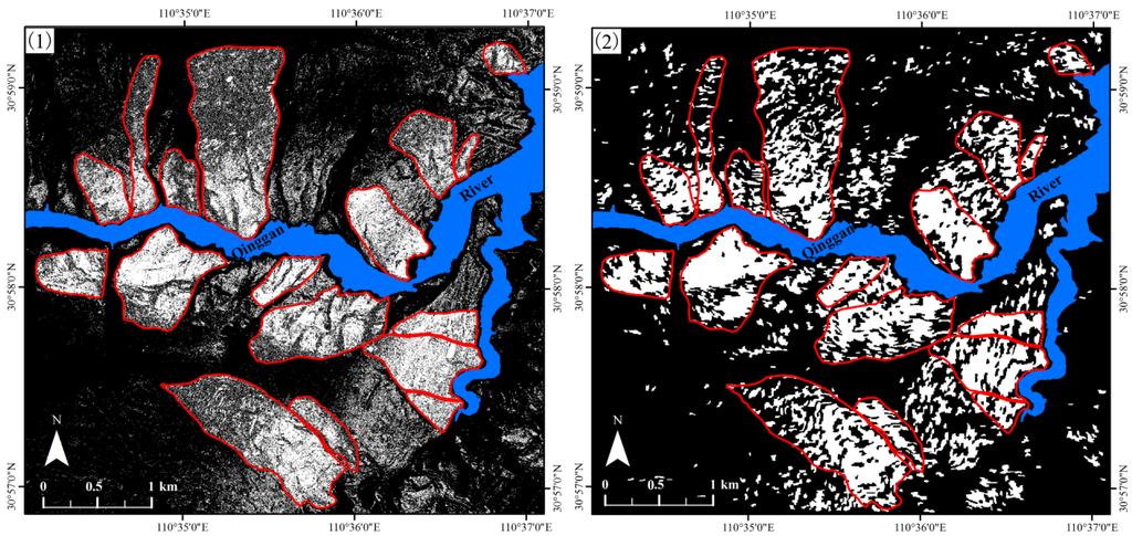 Classification results for the study area: (1) pixel-based [42], (2) object-based. White and black patches represent the objects (pixels) classified as OLS (PLS) and ONLS (PNLS), respectively. Red solid lines represent the referenced landslide inventory map, and the blue area represents the Qinggan River.