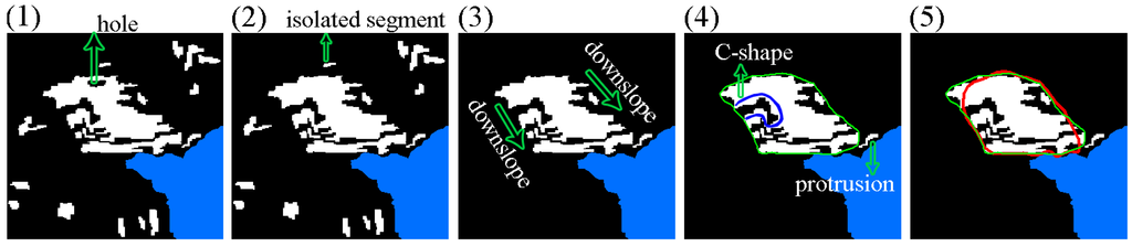 There are many segmentation procedures, but MRS [61] is used by most landslide studies, and is probably the most popular and important segmentation algorithm [39,62]. MRS is a region-growing image segmentation algorithm that merges individual pixels with their most similar neighbors, until the threshold of the within-object heterogeneity is reached [63].