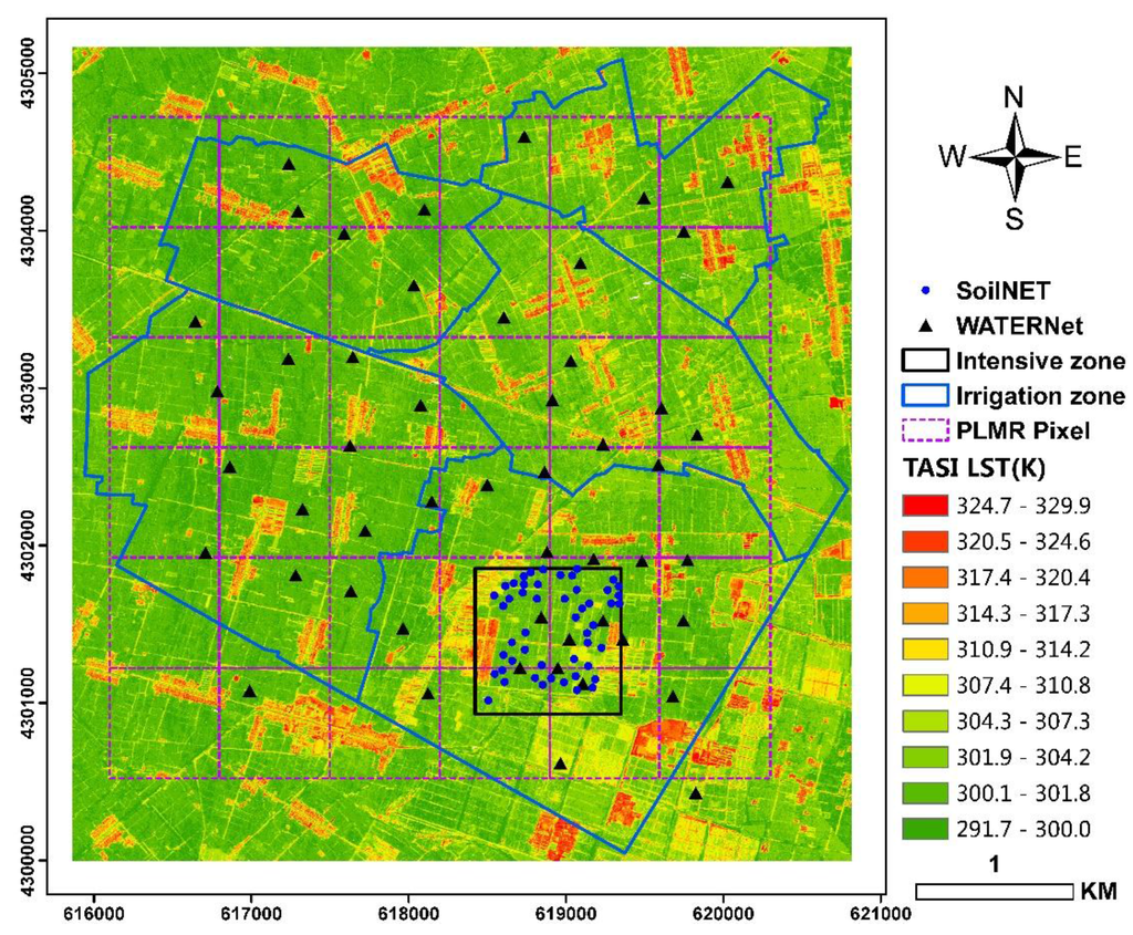 Soil moisture monitoring network in the Yingke–Daman irrigation district. The triangles and circles show the measurement locations of the WATERNET and SoilNET wireless sensor network, respectively. The background is a 3 m resolution Thermal Airborne Spectrographic Imager (TASI) for land surface Temperature (LST) retrieval.