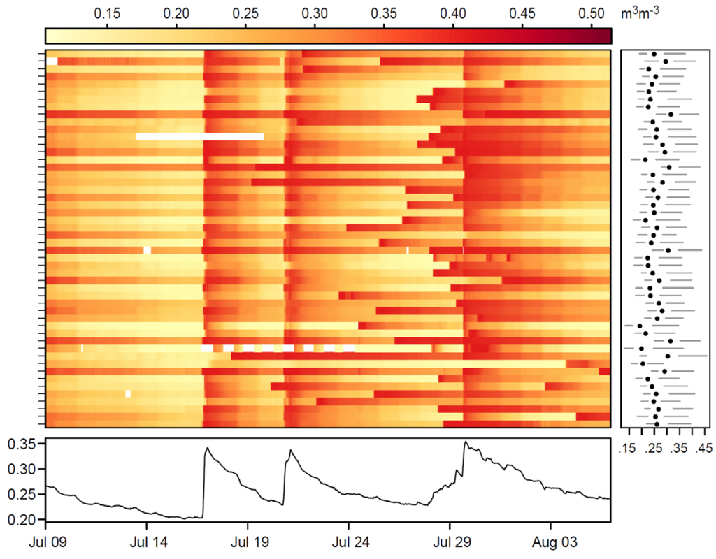 In this study, 28 days of WATERNET surface soil moisture observations were obtained from the HiWATER website [15]. Figure 2 shows a multiple time series plot of 50 WATERNET observations from 9 July to 5 August 2012, made with the mvtsplot package in R [33]. From Figure 2, we can conclude that soil moisture has a significant temporal variation, especially when precipitation (16, 21, 30 July) or irrigation occurs. Moreover, unscheduled agriculture irrigation, particularly between 21 and 30 July, also leads to a strong heterogeneity of soil moisture.