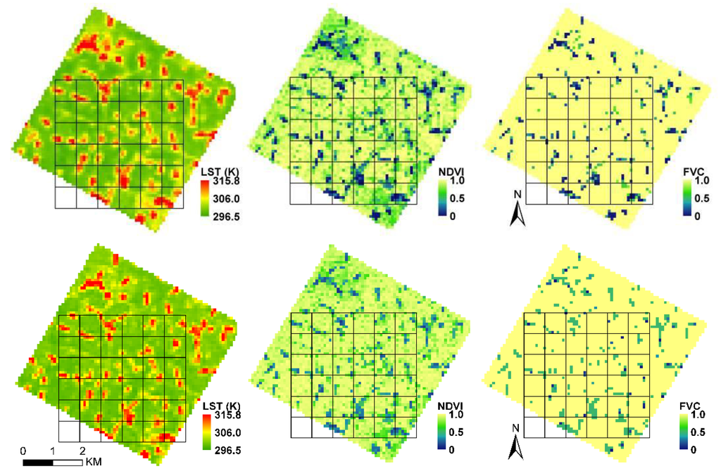 ASTER-derived LST, NDVI, and FVC on 10 July 2012 (top) and 2 August 2012 (bottom). The 6 × 6 grids represent the PLMR pixels coverage.