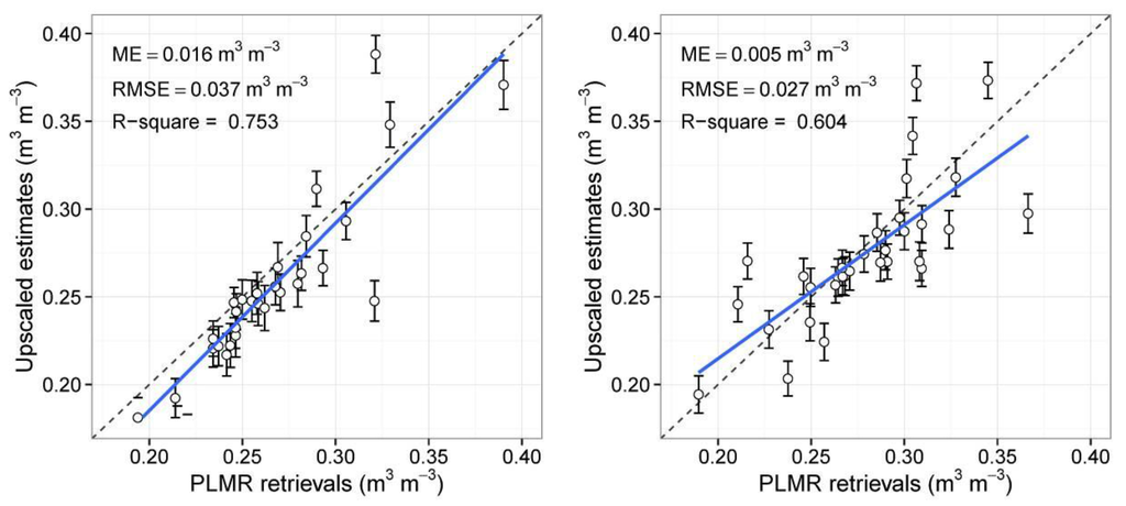 Comparison of the STRBK upscaled predictions with the values of PLMR retrievals on 10 July (left), and 2 August 2012 (right). The blue line is the fitted linear regression, the dashed line is the 1:1 line. The error bars show the 95% prediction intervals, as derived from the block kriging variances.