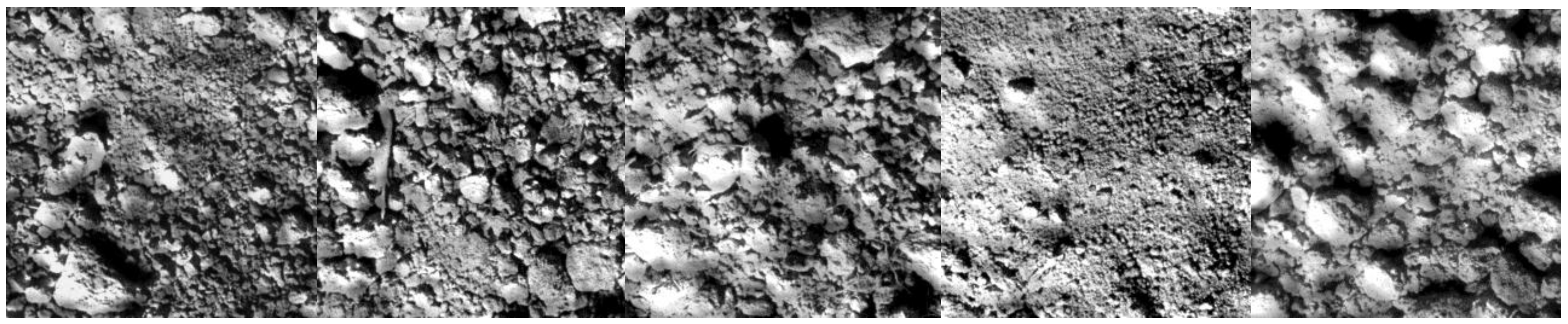 As an example, Figure 4 shows five soil sample images, which most appropriate characterizse our measurement situation in the laboratory. A number of effects influence the obtained measurements. Even for grinded samples, we have to be aware of effects due to different particle sizes [28]; reflectances general decrease with increasing particle size due to an increase of micro-shadows. Strong contrasts between illuminated and shadowed image regions result from the prevailing direct illumination of the light source (and a low diffuse illumination term). In addition, an irregular surface roughness induces a multidirectional (anisotropic) light scattering, which, for example, cannot be compensated by usual scatter corrections (as the standard normal variate [29] or the multiplicative scatter correction [30]).