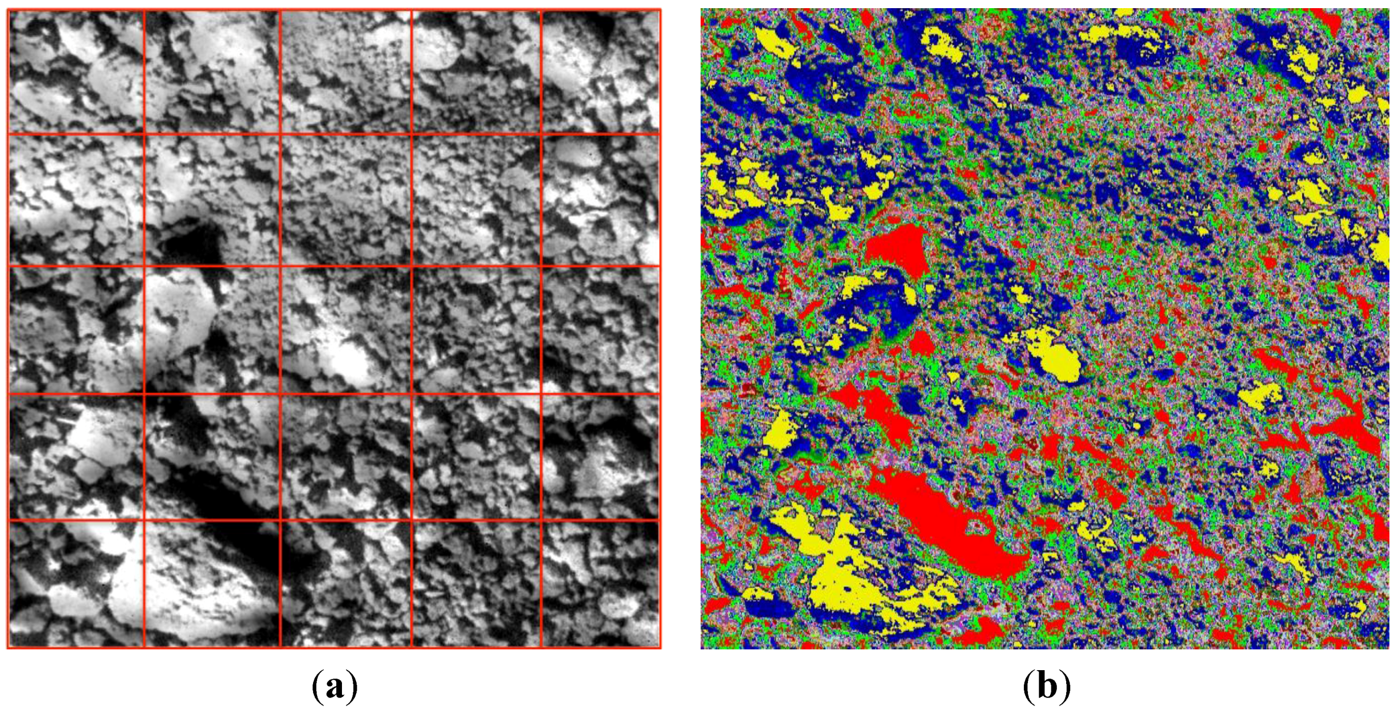 Segmentation matrix (a) and k-means clusters (b) of a raw soil image.