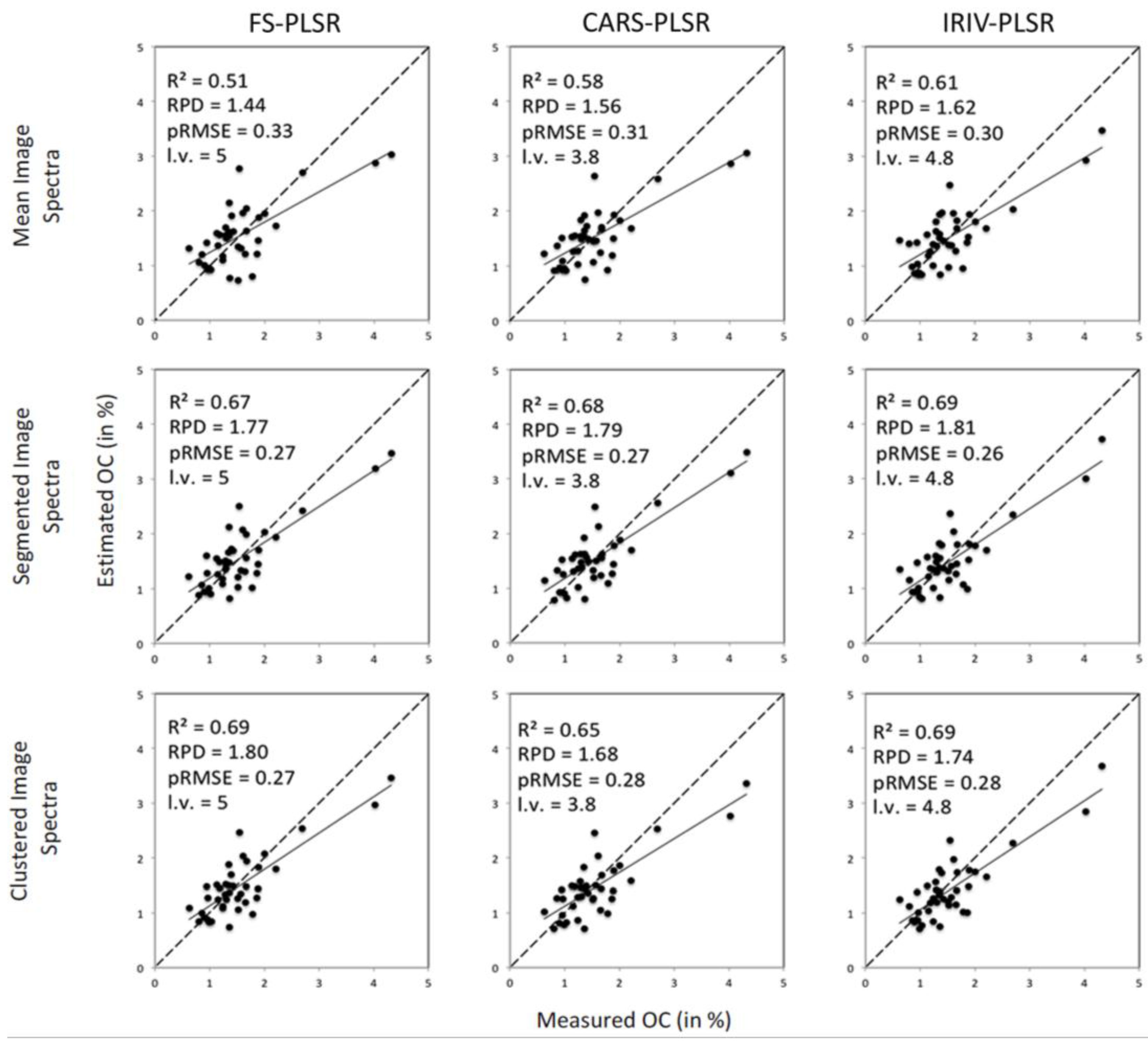 Estimated vs. measured values of OC (in %) obtained for image mean spectra and segmented images with three different PLSR approaches.
