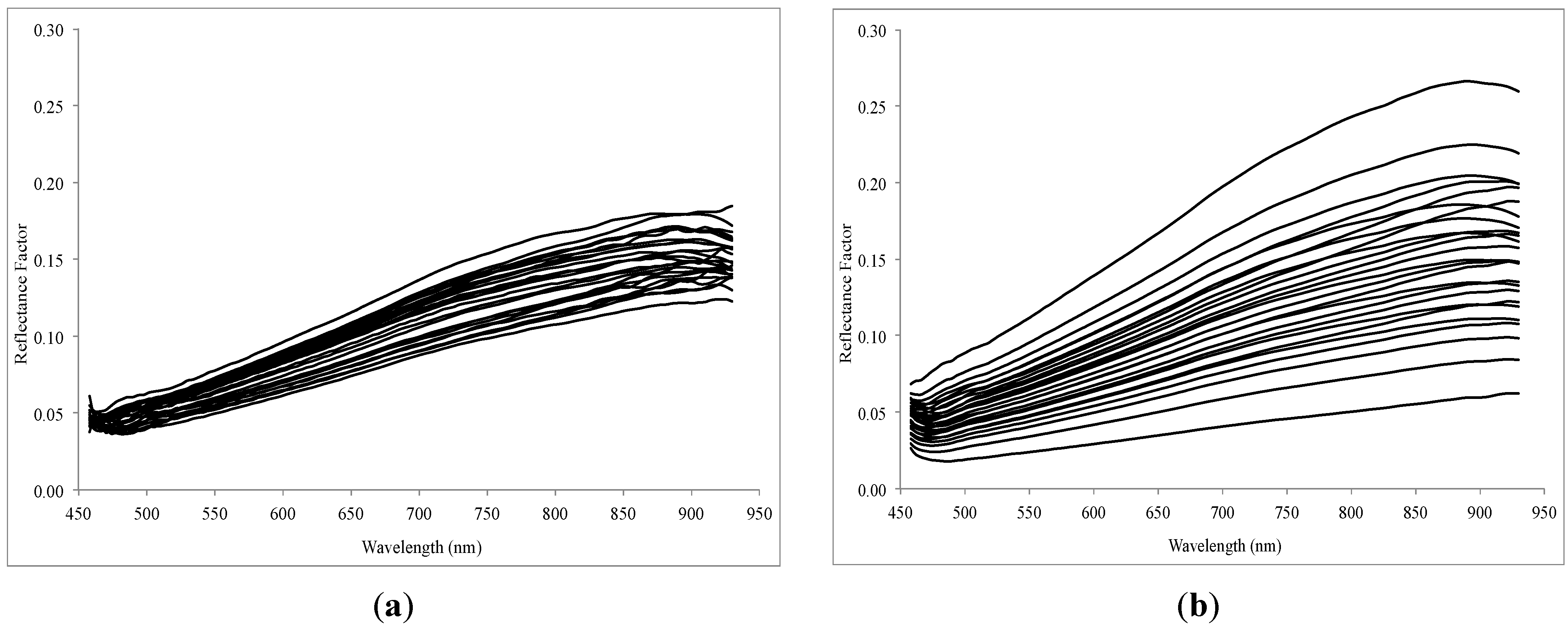 (a) Mean spectra of the 25 regular sub-images (Figure 5a) and (b) mean spectra of the 25 k-means clusters (Figure 5b).