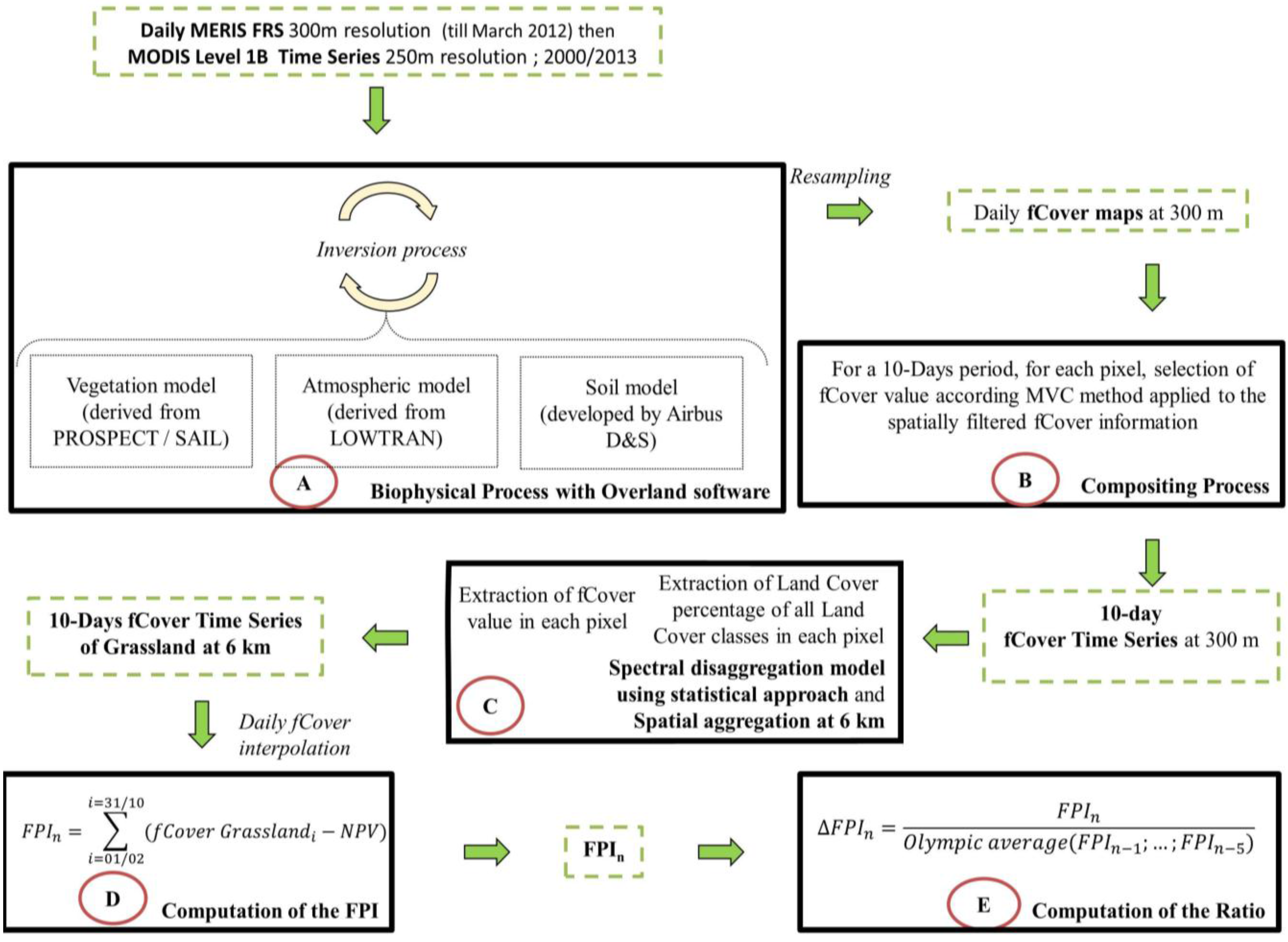 36]. They developed an indicator called Forage Production Index (FPI) to estimate and monitor in near real-time the forage abundance in France. This insurance product will be offered to farmers to offset losses from drought and other extreme meteorological events. Processing is fully automatic and is based on the biophysical parameter fraction of green vegetation cover (fCover) obtained from MODIS time series images (at 250 m spatial resolution).
