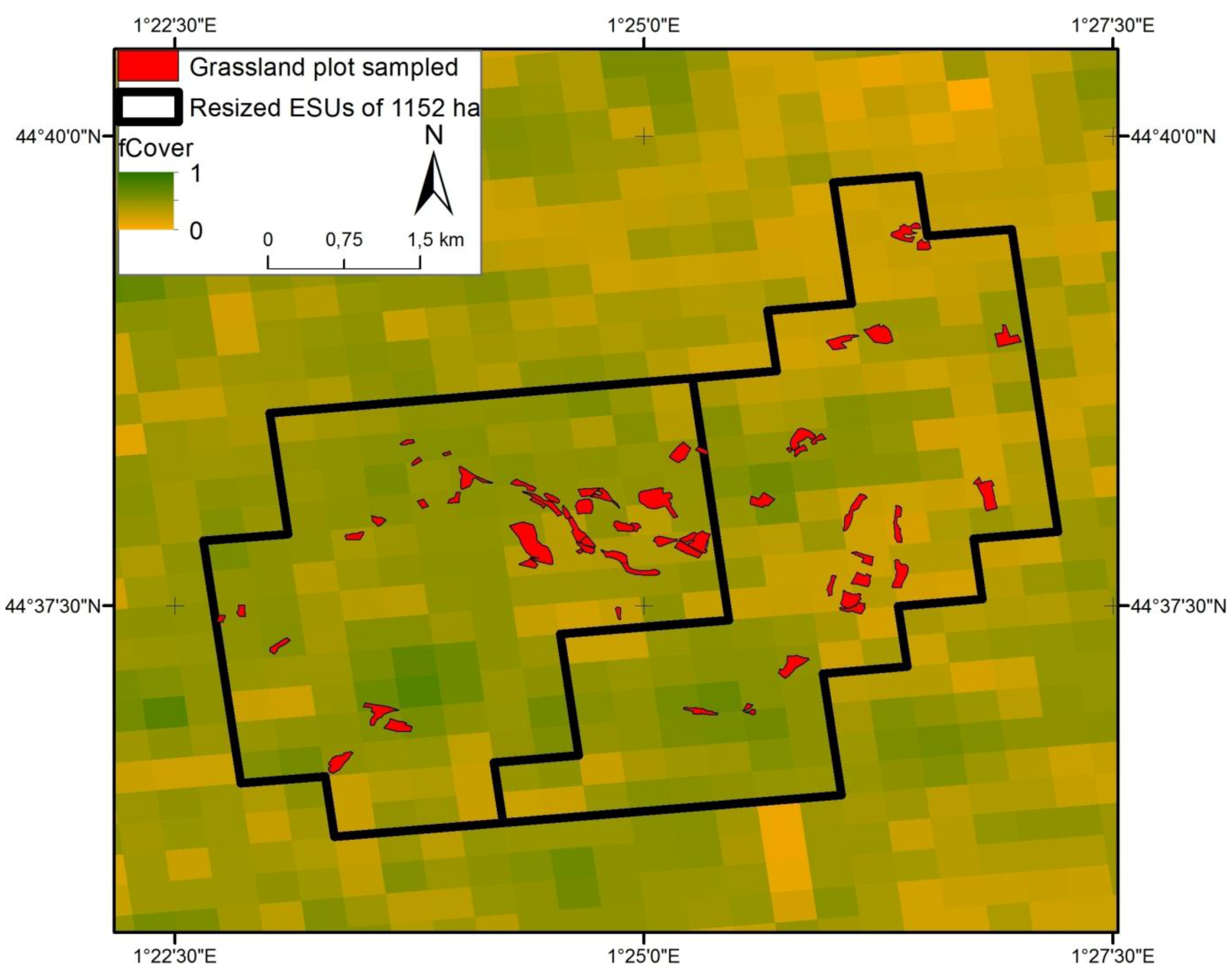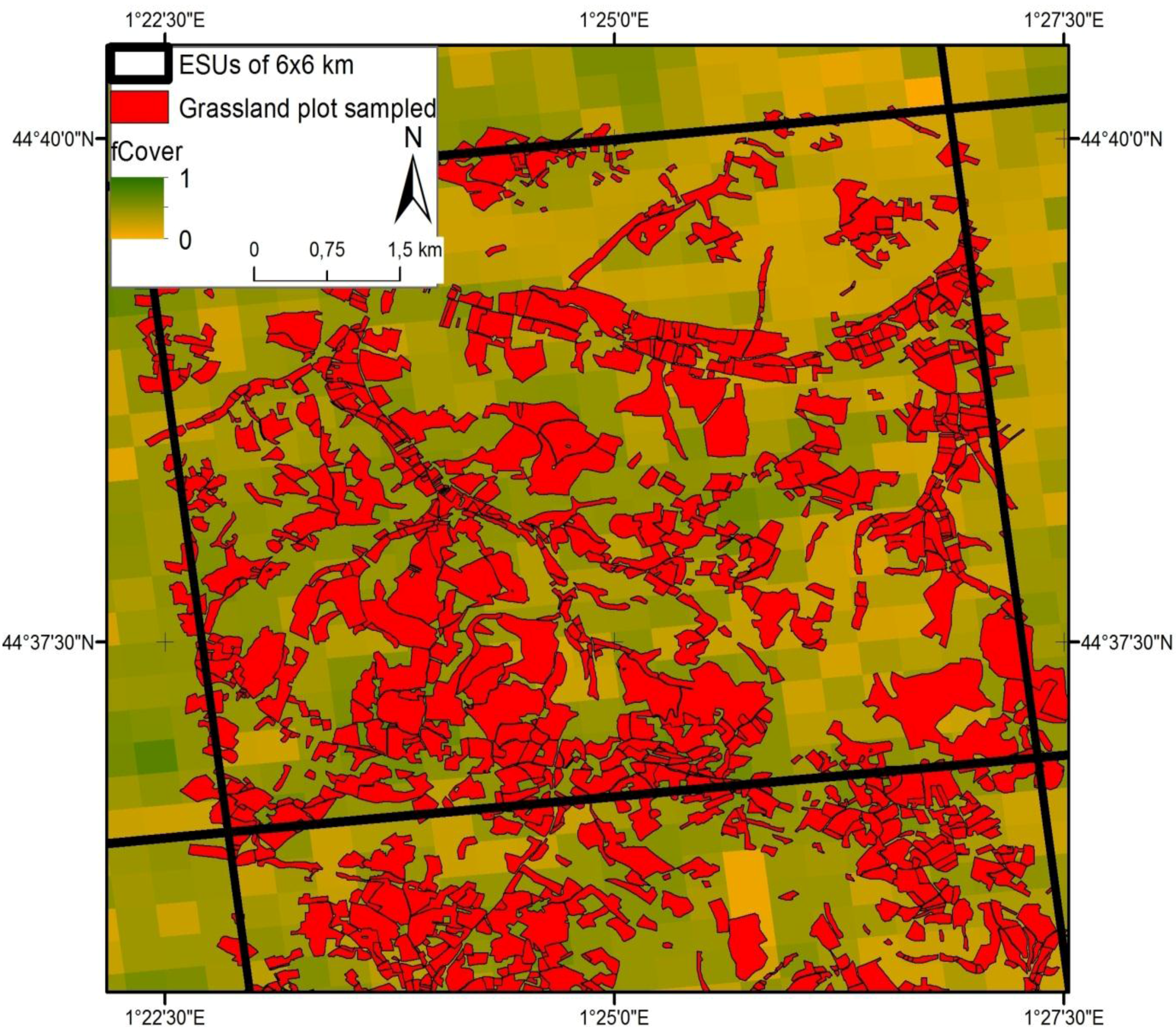 Figure 1C). This method estimates fCover values for each land cover class from the input of fCover estimates for a population and the a priori knowledge of each land cover class’s contribution to each pixel (local aspect). Consequently, fCover was calculated at an Elementary Statistical Unit (ESU) scale of 6 km × 6 km. The land cover database used for disaggregation was provided by farmer declarations in the 2012 Common Agricultural Policy (RPG Anonyme ASP 2012) and completed with the Corine Land Cover Database 2006 (European Environment Agency, 2012). Surfaces of each land cover in the ESU are combined and form the final land cover database. The grassland class contains natural (native or sown six years or more) and temporal (sown less than six years with a minimum of 20%