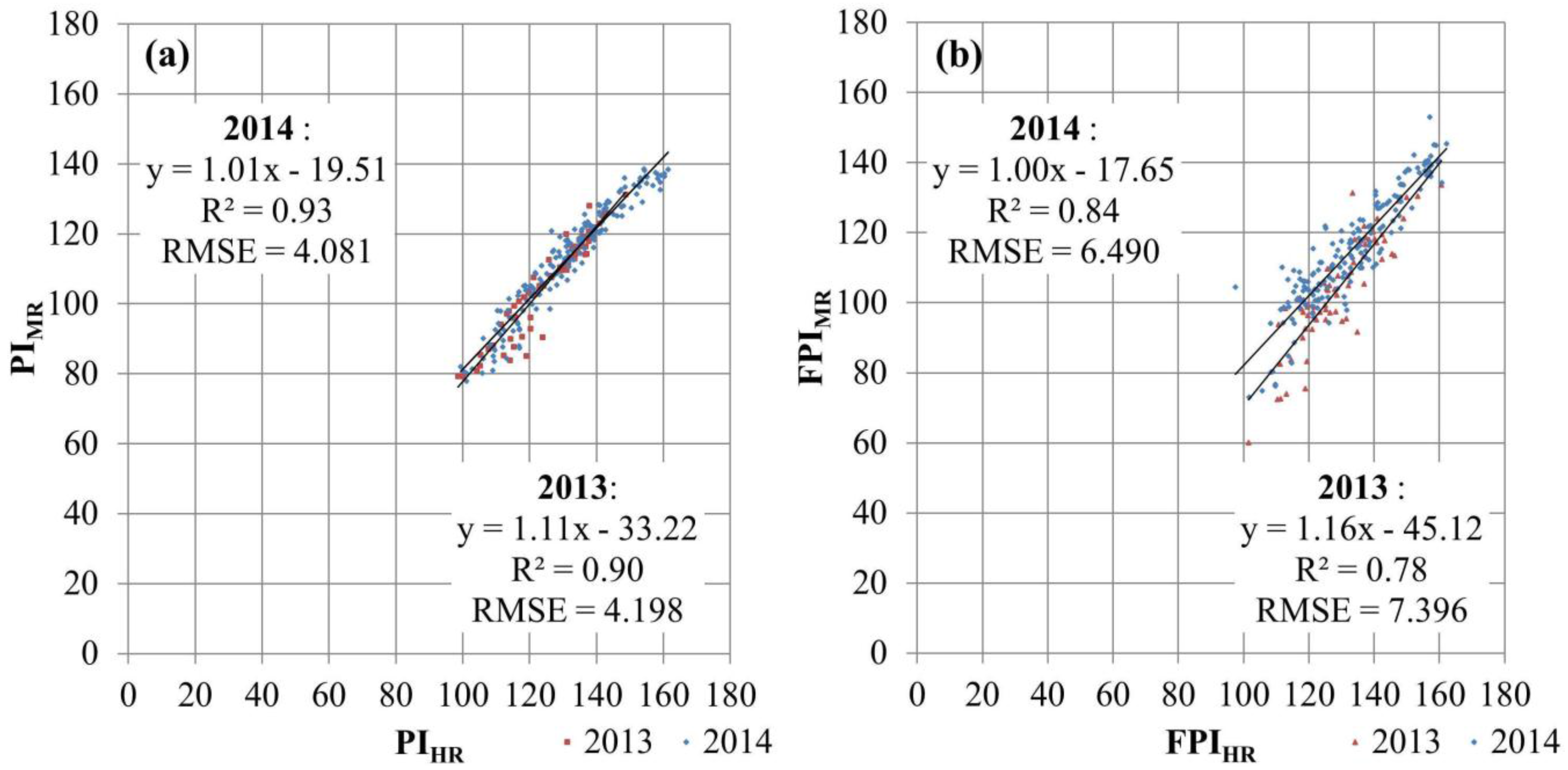 Finally, the same analysis as the one conducted in the direct comparison was performed (cf. 2.2.4). In this case, the ΔFPIMR was compared to the ΔFPIHR (Equations (6) and (7)). The HR time series included images only from 2013 and 2014. Variation in biomass production in 2014 was quantified based on the one for 2013.