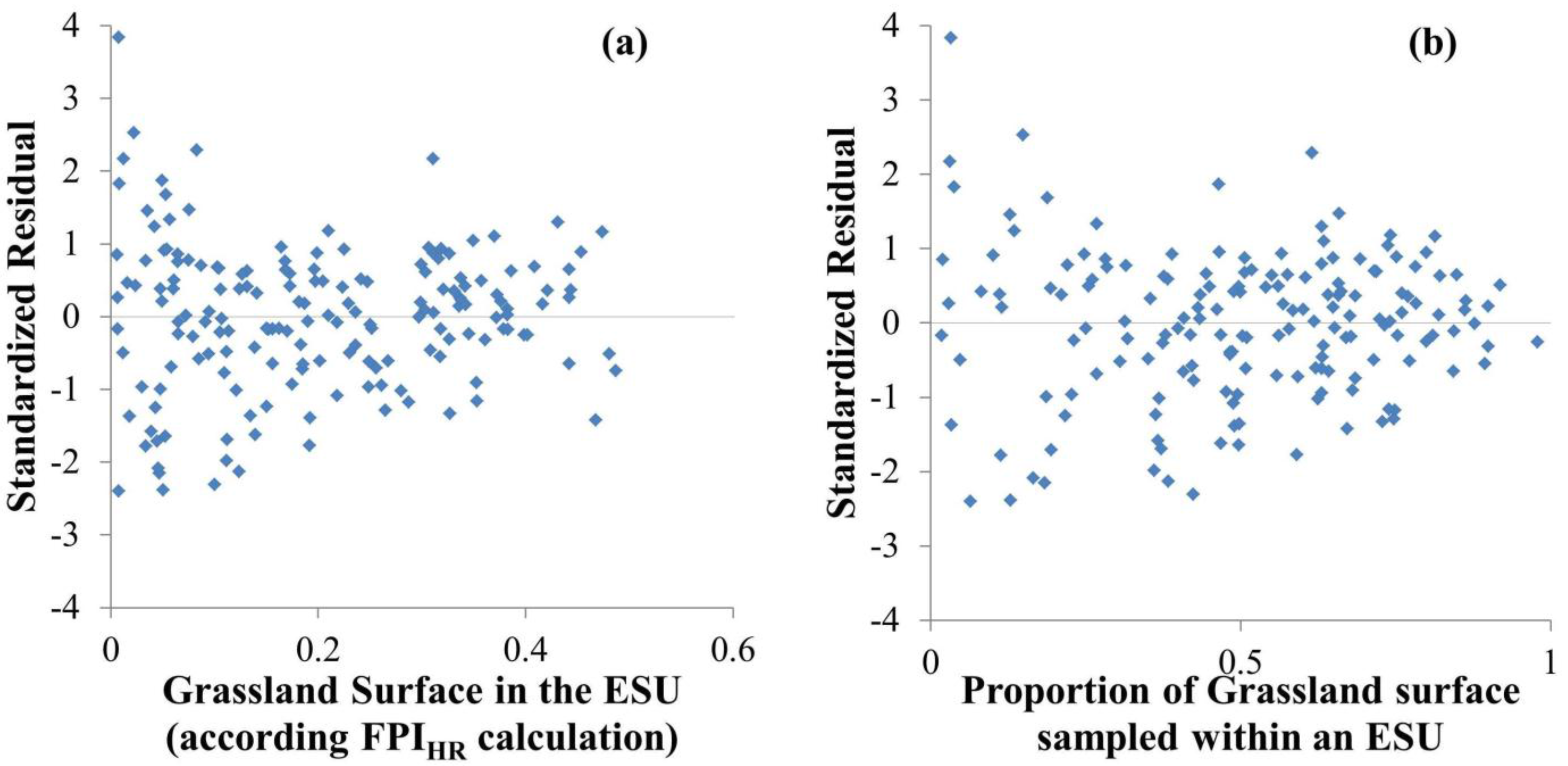 Standardized residuals of the linear regression for 2014 between FPIMR and FPIHR according to (a) the percentage of grassland surface in the ESU (for 173 ESUs of 3600 ha). (b) The percentage of grassland sampled to build the FPIHR in the ESU (for 173 ESUs of 3600 ha).