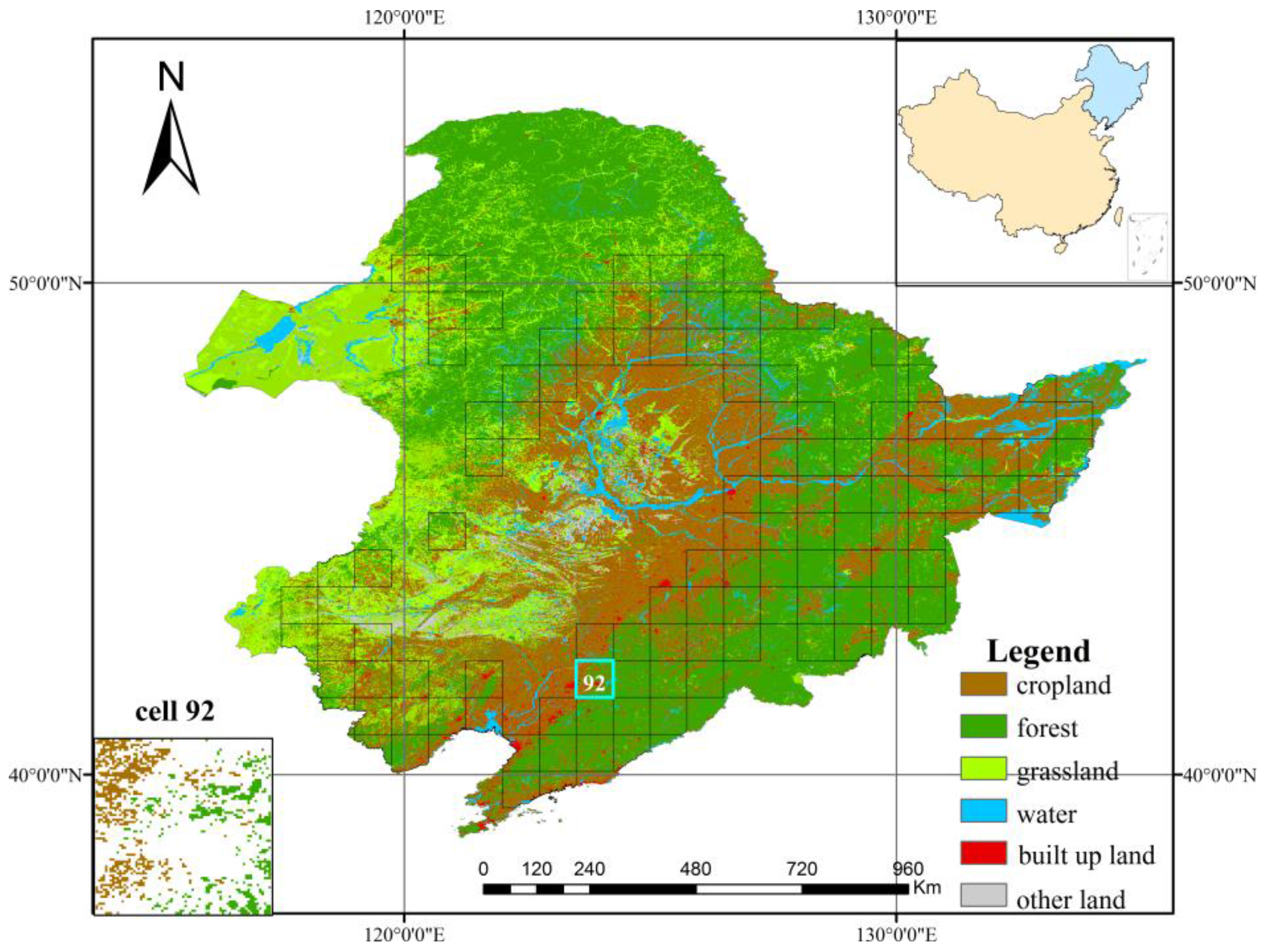 The study area, Northeastern China. Each outlined cell contains sufficient number of forest and cropland pixels (at least > 20 each) for comparisons. In the study, the comparison of biophysical variables and energy budget changes between forest and cropland is restricted to these cells.