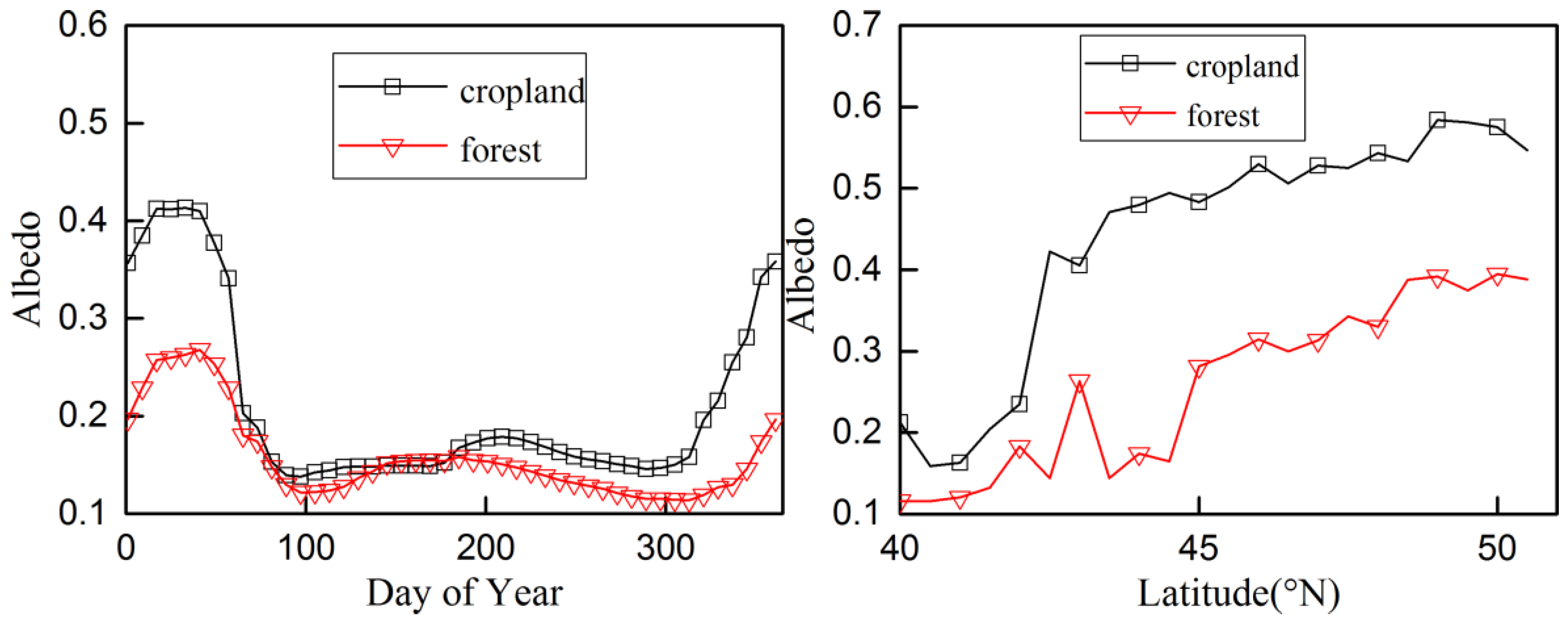 3.1. Differences between Cropland and Forest Albedo