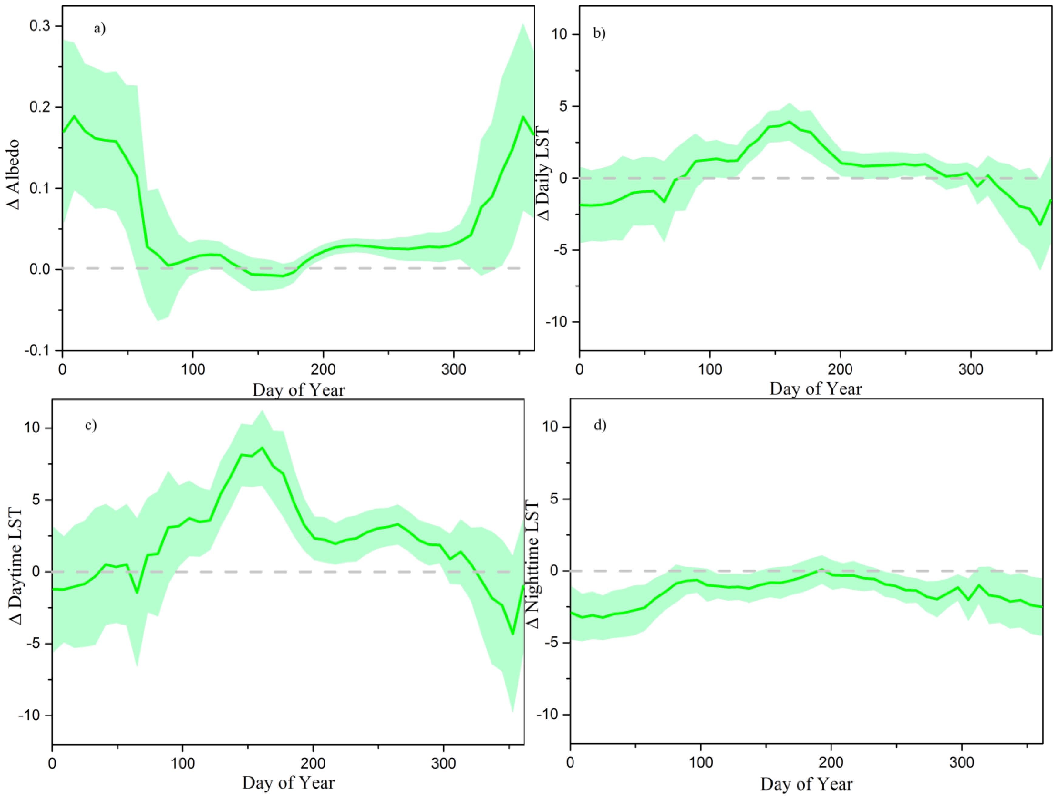 Mean seasonal variation of differences (cropland minus forest) in (a) albedo, (b) daily LST, (c) daytime LST, and (d) nighttime LST. The lines and shaded areas represent the mean and standard deviation (SD) of all sample cells, respectively.