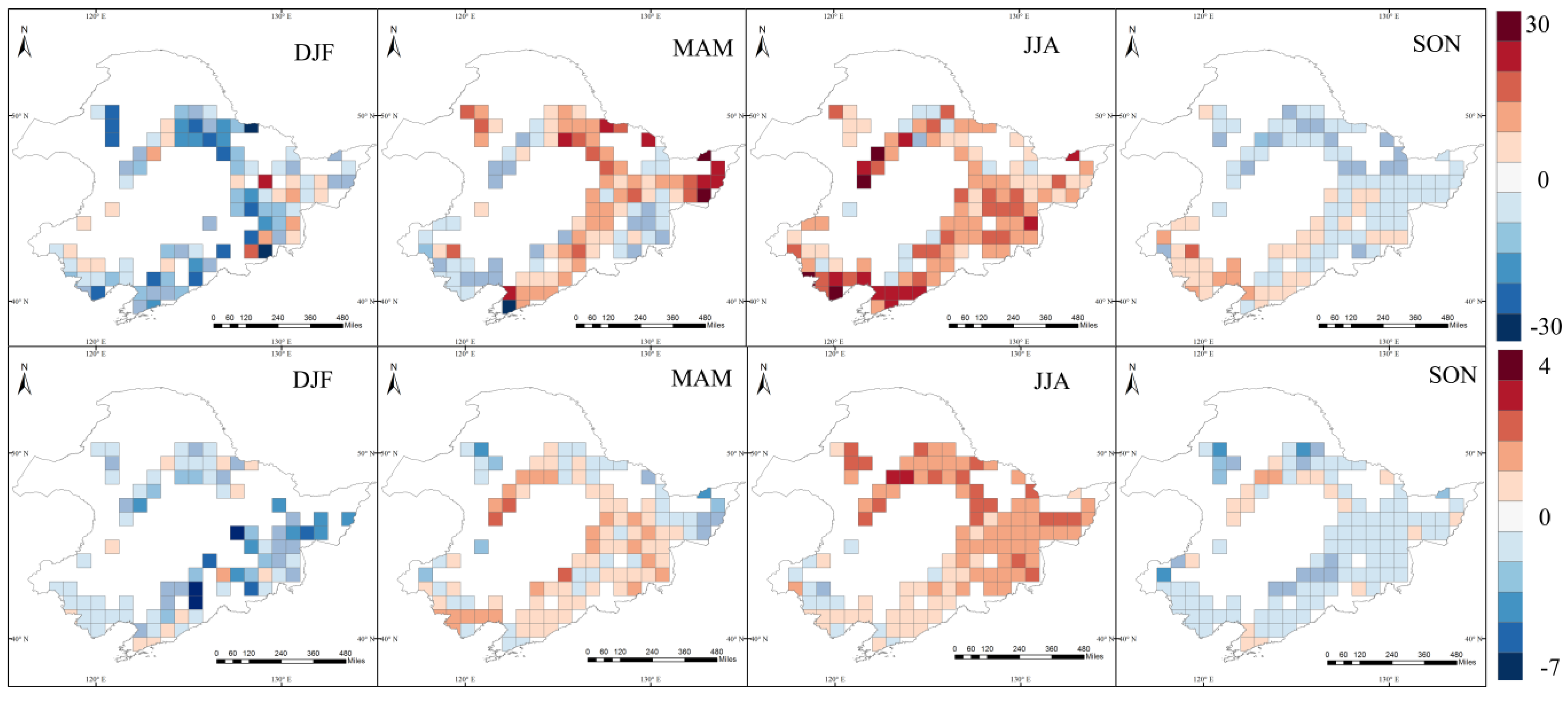 Spatial patterns of seasonal ΔH (upper panel, unit: W∙m−2) and ΔLST (lower panel, unit: K) for potential land conversion from forest to cropland. The mapped values here represent the difference in energy budget and LST of forest and cropland in each selected cell.