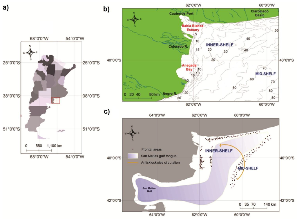 Location of the study area. (a) south of Buenos Aires Province, Argentina; (b) Bathymetry map of the study area; (c) scheme of the main physical oceanographic processes in the study area accordingly to[2,4].