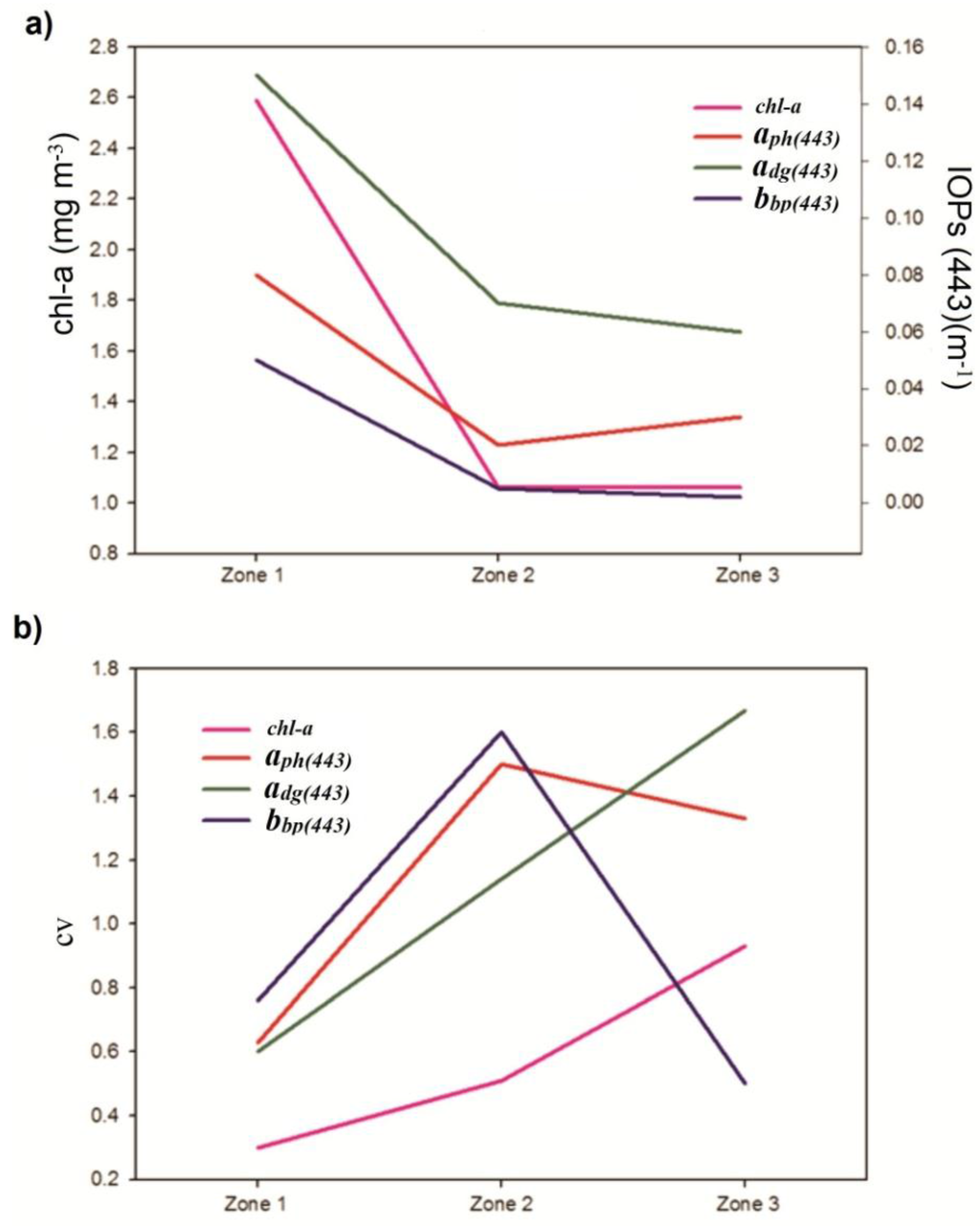 Climatology of the IOPs in the study area. (a) Mean values; (b) coefficient of variation.