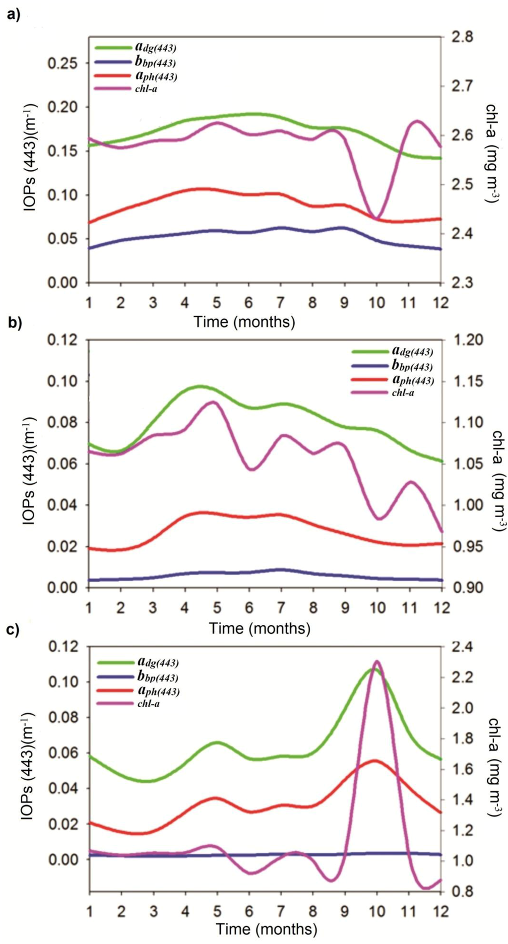 Climatology of the bio-optical parameters in the (a) coastal zone; (b) the inner-shelf, and (c) the mid-shelf.
