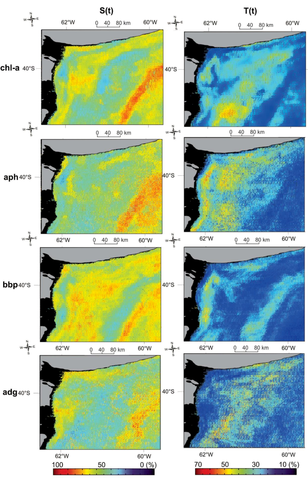 For adg(443), the seasonal term (S variance) prevailed in zone 1 and 3 ( 60–80%), meanwhile in the inner-shelf the trend term (T variance) was more important ( > 50%) (Figure 6). A negative adg(443) monotonic trend was detected in the entire study area, increasing from the coast to the mid-shelf (−3% to −5% yr−1). bbp(443) seasonal component prevailed over the coastal zone, inner and mid shelf ( 60–80%), though in the frontal areas (between zone 1 and 2 and zone 2 and 3) the trend signal was dominant ( 40–60%) (Figure 6). The bbp(443) monotonic trend was positive in the frontal area between zone 1 and 2, showing the highest values in front of Anegada bay and from the mouth of the Bahía Blanca Estuary up to the Claromecó basin (>5% yr−1). In contrast, most of the shelf region exhibits a negative tendency of −3% yr−1.