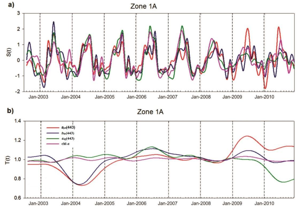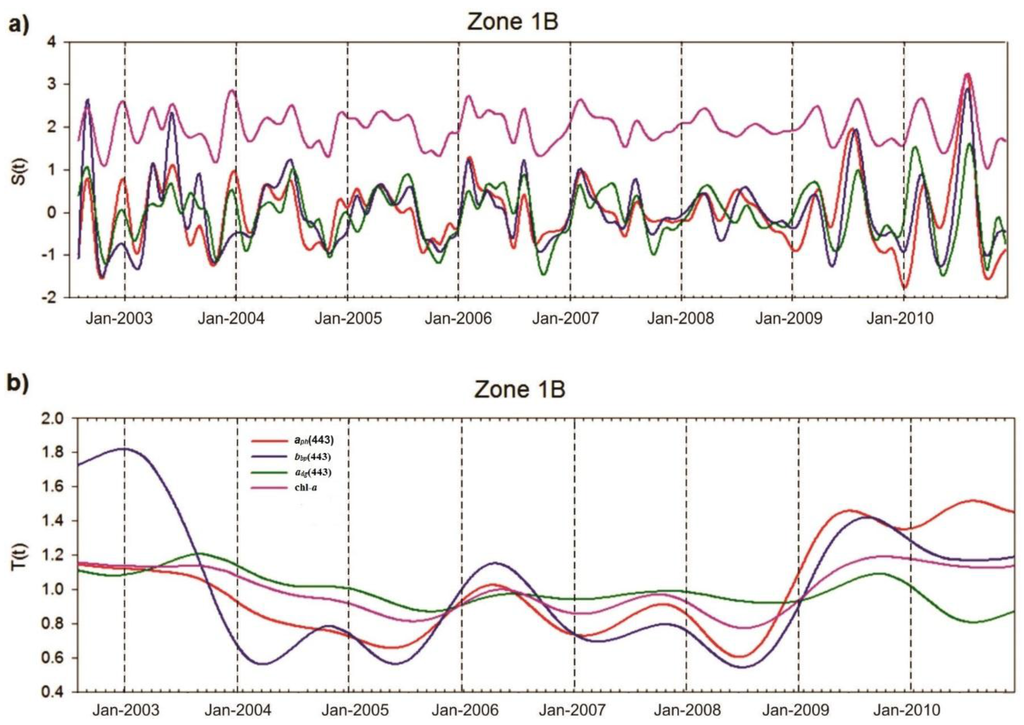 In zone 1B (north of Colorado River discharge), all parameters showed, between 2002–2008, relatively low seasonal amplitude, with maxima mainly occurring in late-spring/early-summer and autumn; meanwhile, minimum values were observed in late-winter (Figure 1, Figure 3 and Figure 8a). The years presenting a minimum for aph(443) and chl-a were found in 2005 and 2008 (Figure 8b). The increase of the trend term observed from 2009 (>50%) is associated with an increase of the amplitude of the seasonal fluctuations. In addition, seasonality changed with maximum values observed in winter, followed by a weaker autumn maximum. The highest peak of bbp(443) T(t) signal was found in 2002–2003 related to high seasonal amplitude (S(t)). The period 2005–2009 presents a variable signal, in concordance with the aph(443) and chl-a, with a peak in 2009. The seasonal signal became stronger for all of them in 2009–2010, having the maxima in winter, followed by a smaller peak in late-summer/autumn. Even though the adg(443) trend term did not have as much variability as the other parameters, the mean values followed the behavior of the other ones.