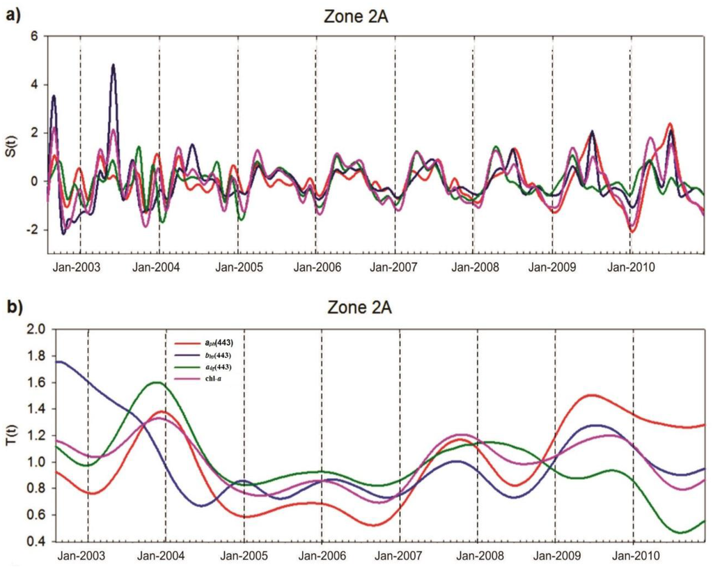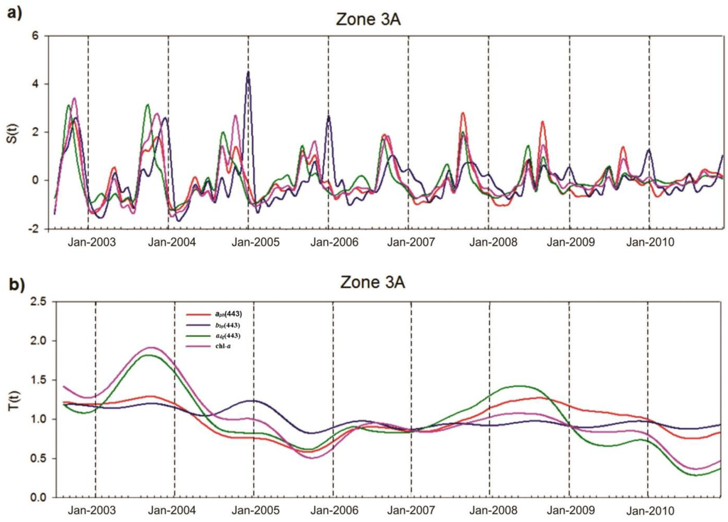 The inner shelf (zone 2A) parameters showed a variable behavior, as expected as it is a transitional zone between the coastal and mid-shelf waters (Figure 1, Figure 2 and Figure 3). The seasonal signal prevailed over the trend cycle signal for bbp(443) and chl-a (60%–70%); meanwhile, the temporal variance of aph(443) and adg(443) products were both equally explained by the T(t) and S(t) signals (Figure 6). bbp(443) seasonality was determined by maximum values in winter and in autumn. The amplitude of the signal was 80% higher in 2002–2003 coincidently with the maxima peak of the T(t) trend. Chl-a highest values were mainly detected in late autumn and winter with slightly higher amplitude in 2002–2003 and 2009–2010 (Figure 9a).