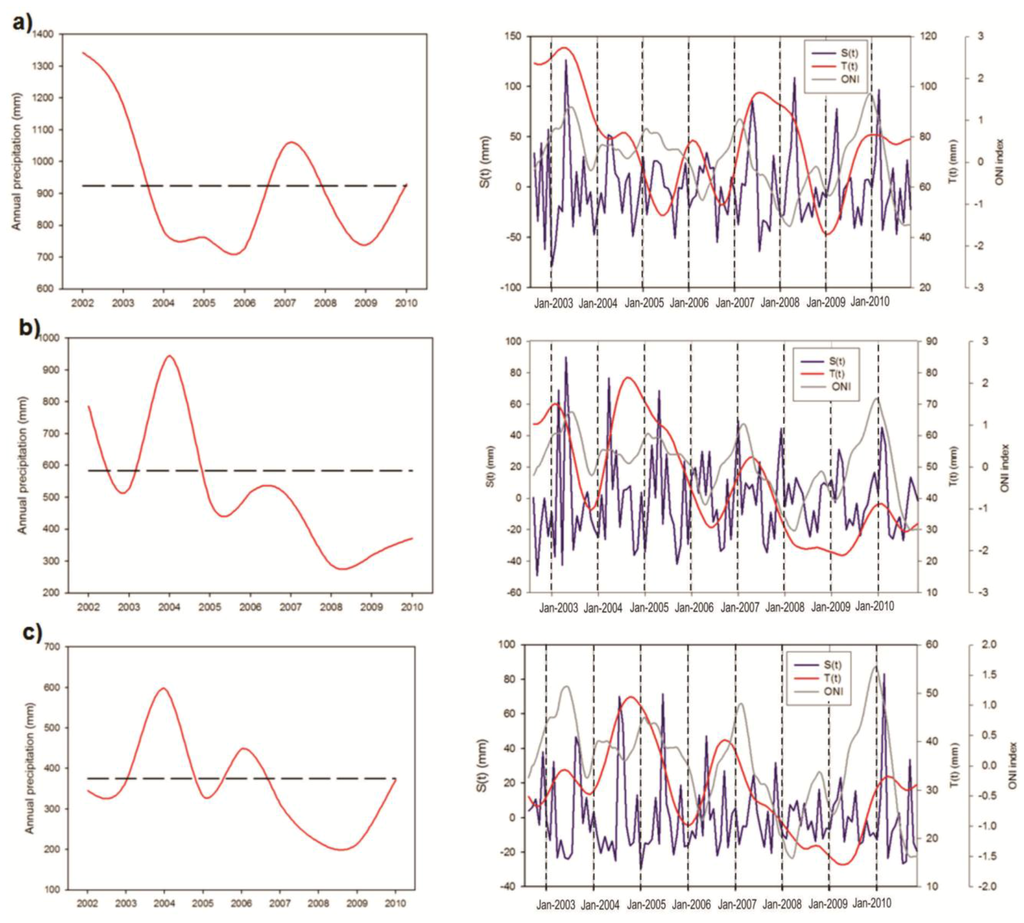 Precipitation variability between 2002 and 2010. The left column is for the total annual precipitation (in situ) (red line) and the mean historical precipitation (dashed line). Right column stands for the Census X-11 statistics and the ONI. (a) Northeast station; (b) Center station; and (c) Southwest station.