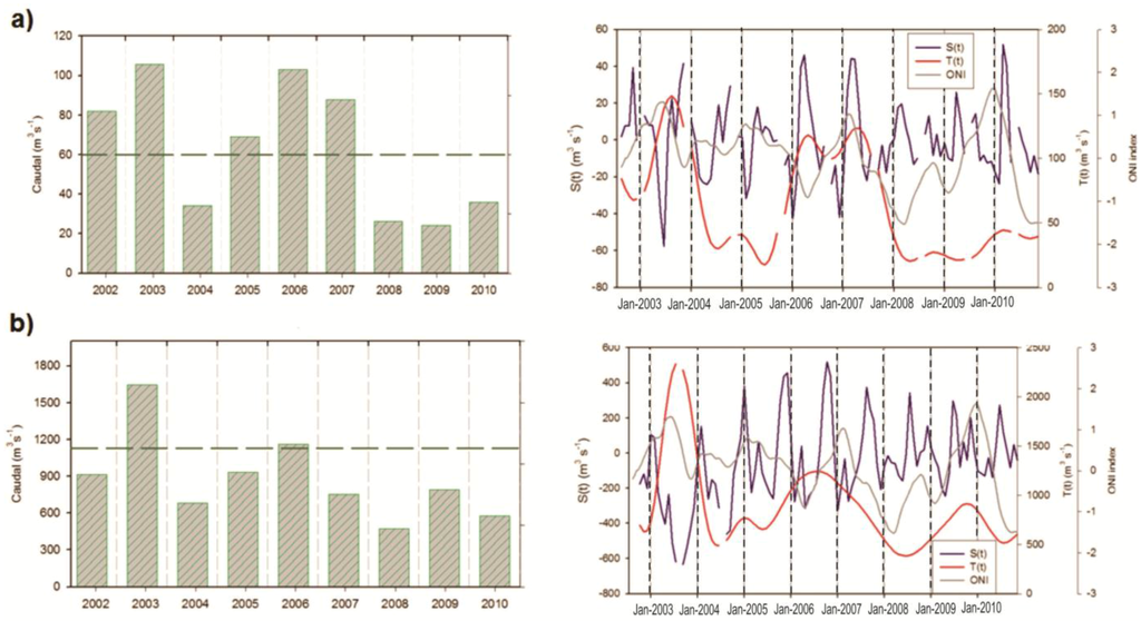 Main river causal variability between 2002 and 2010. The left column is for the total annual discharge (in situ) (grey bars) and the mean historical discharge (dashed line). Right column stands for the Census X-11 statistics and the ONI. (a) Colorado River; and (b) Negro River.