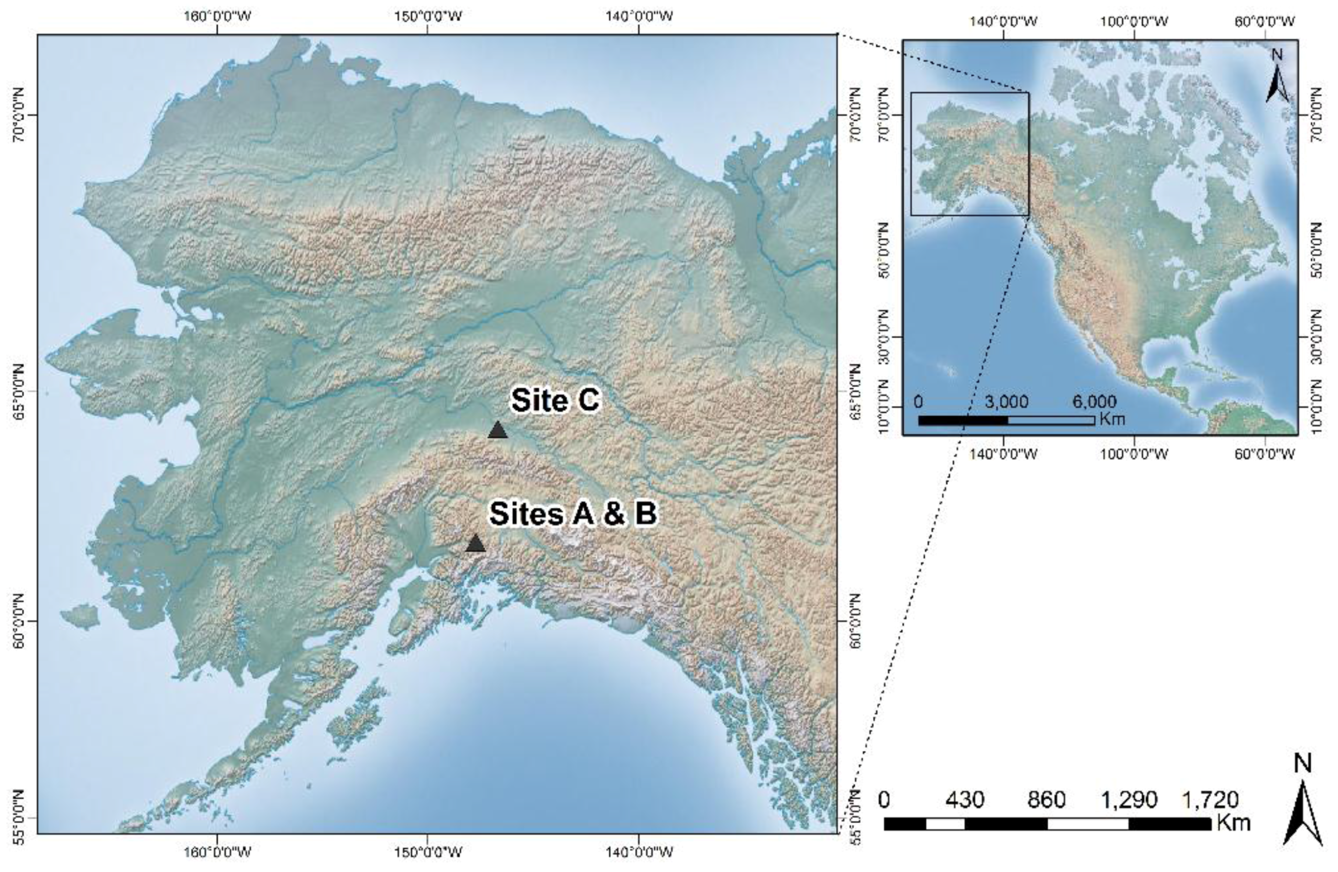 Topographic relief map showing the location of Study Sites A, B and C in Alaska, U.S.A. (Shaded relief map courtesy of the Earth Systems Research Institute, ESRI).