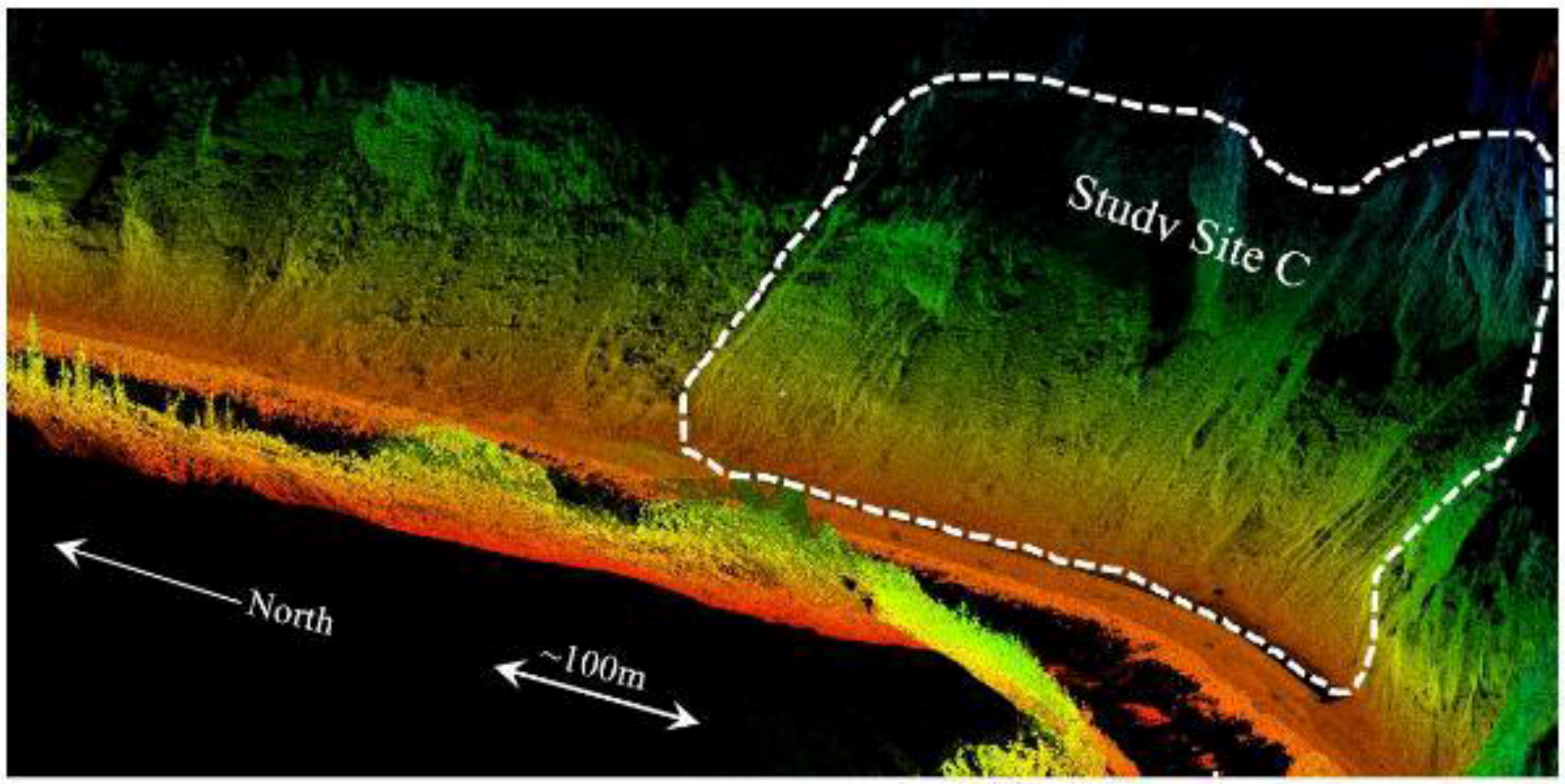 For the 2013 and 2014 surveys, both the baseline and in-situ scans were geo-referenced following the methodology presented in [27,42] using the program PointReg. The methodology was developed for efficient surveying in dynamic environments (e.g., coastal areas, active landslides) where survey control can be difficult to establish and maintain. Although other geo-referencing procedures can be implemented, such as the approach implemented in the 2012 survey, the PointReg approach can minimize field time, since targets are not required [43].