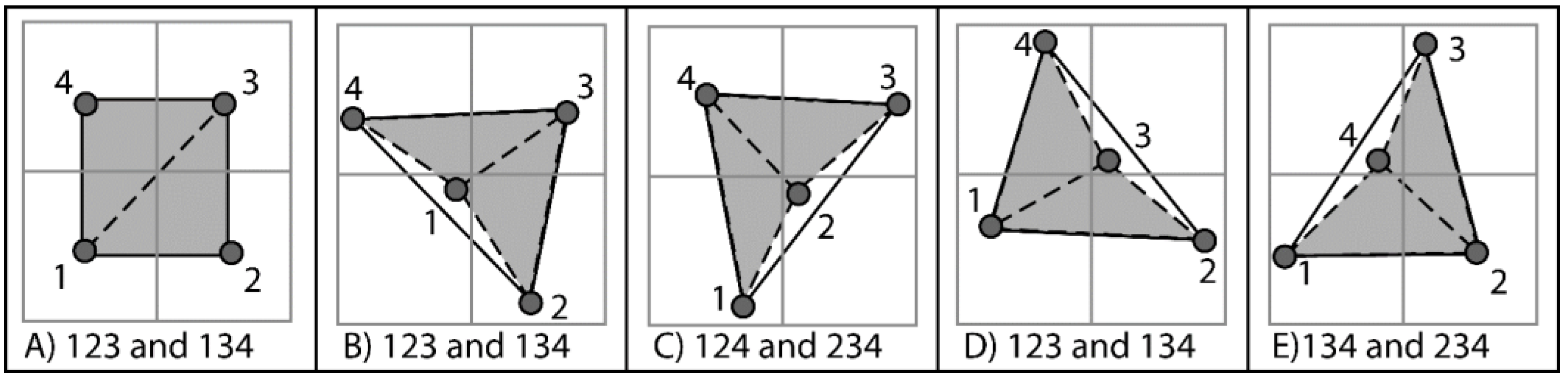 Once centroids have been found for all cells, a hole filling operation can be completed to create interpolated points in cells with insufficient data. The specifics of the hole filling approach will be described in more detail in the next section. Following hole filling, the triangulation is then formed using the rules established in Olsen et al. [40] (Figure 4). In this approach, the positions of the centroids of four adjacent cells are evaluated to determine the appropriate connections to avoid intersections of triangles. Although there are five potential scenarios, only two triangulation patterns are needed, which can quickly be determined with a point in triangle test. This method proves to be very efficient because the cell centroids are structured and simple to connect with these rules.