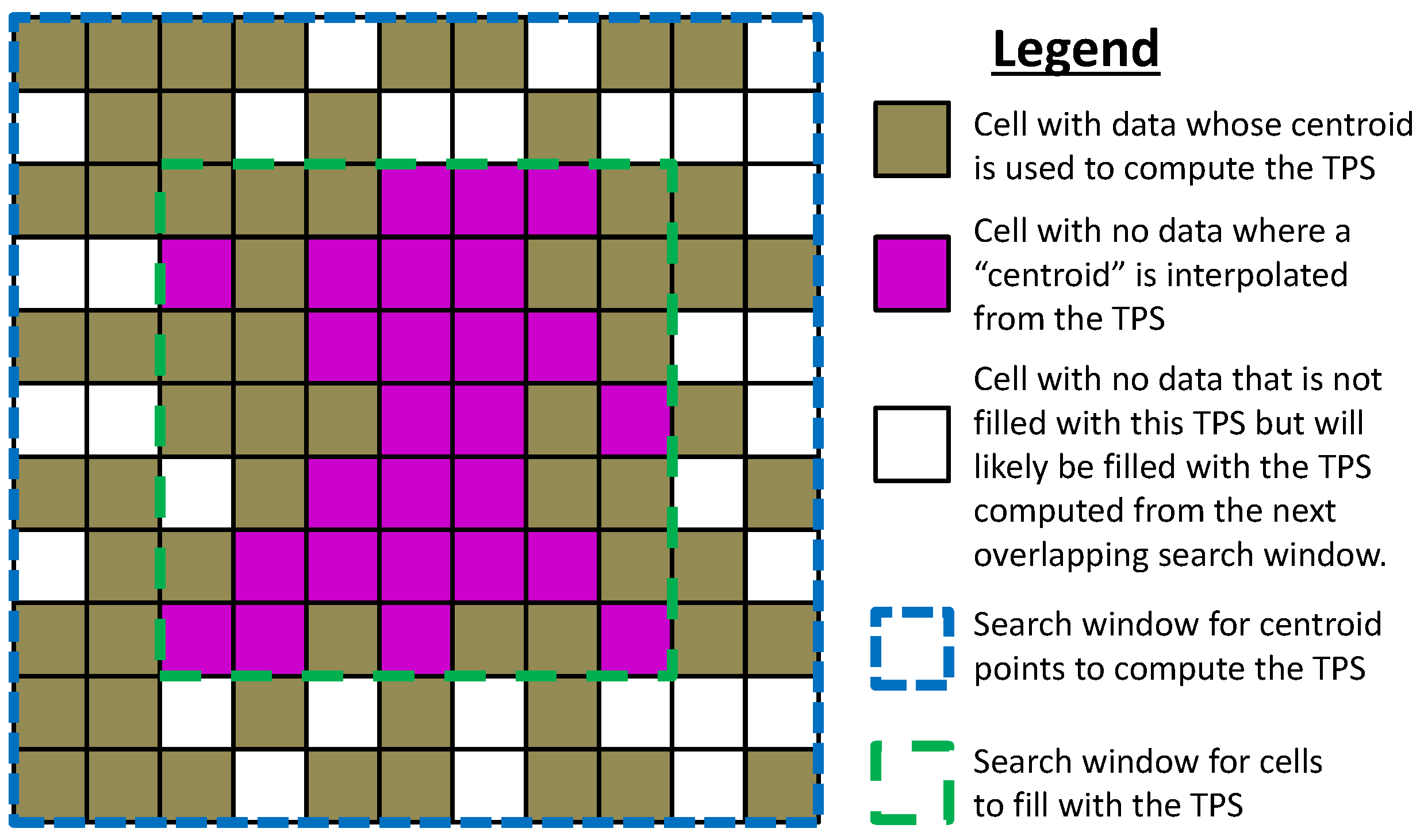 Holes in the model were filled by generating a thin plate spline (TPS) from the cell centroid points in cells surrounding the holes (Figure 5). Because the TPS technique is computationally inefficient across large point cloud datasets, a TPS is computed for a small window of the dataset at a time. However, note that large holes require a larger window size to be filled. To avoid poor fits in areas with sparse data, 50% of the cells in the window were required to have data in order for holes within that window to be filled. Also, to minimize artifacts and edge effects, holes are only filled in the center cells of the window. For purposes of this study, the window size is defined as the number of pixels included in each direction outward from the center pixel that are included for the hole filling. For example, with a window size of 5 (11 × 11 cells), all cells with data in the 11 × 11 cells were used to compute the TPS, but cells with holes were only filled in the center 6 × 6 cells (Figure 5). Note that the interpolated points are not used in the next overlapping window to compute the TPS.