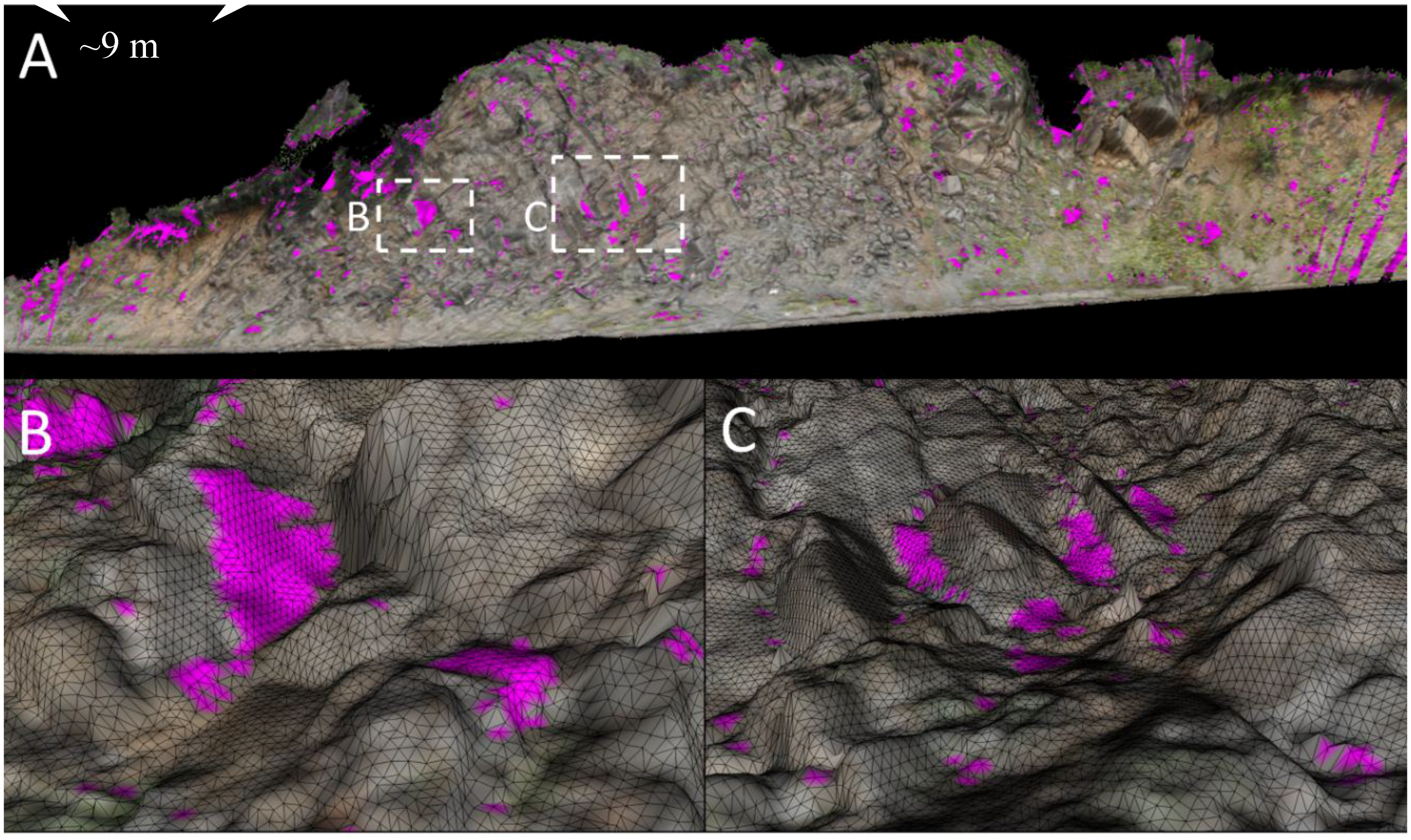 Example of hole filling for the 2014 surface model for Site A using a grid cell size of 0.05 m and window size of 20 (i.e., TPS search window of 41 × 41 cells (2 × 2 m) but hole fill size of 21 × 21 cells (1 × 1 m)). Inserts B and C show more detail of the TPS effectively filling both large and small holes. The filled holes are shown in magenta while scan data are shown with the natural RGB color.