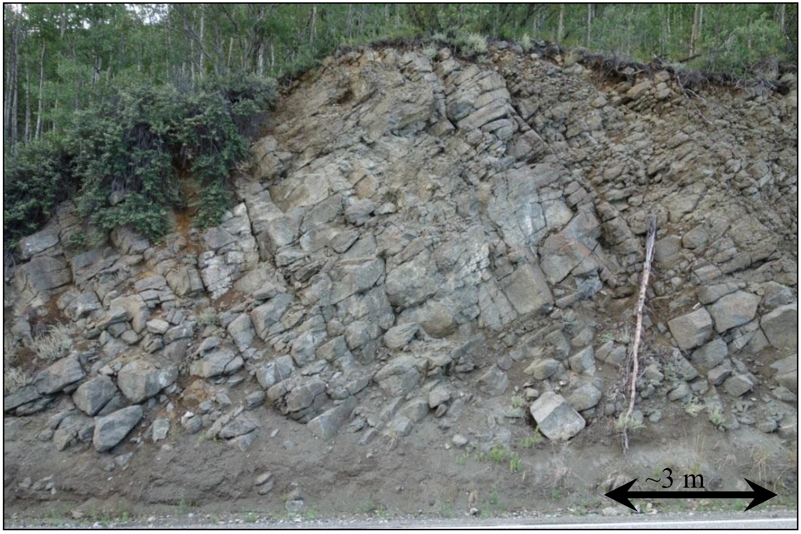 | C | 63.756959°N 148.899051°W | 340 | 170 | 45° | Heavily metamorphosed schists and phylittes, intruded by large volcanic dikes at some locations. Highly weathered, medium strong muscovite-quartz and micaceous-quartz schist. |