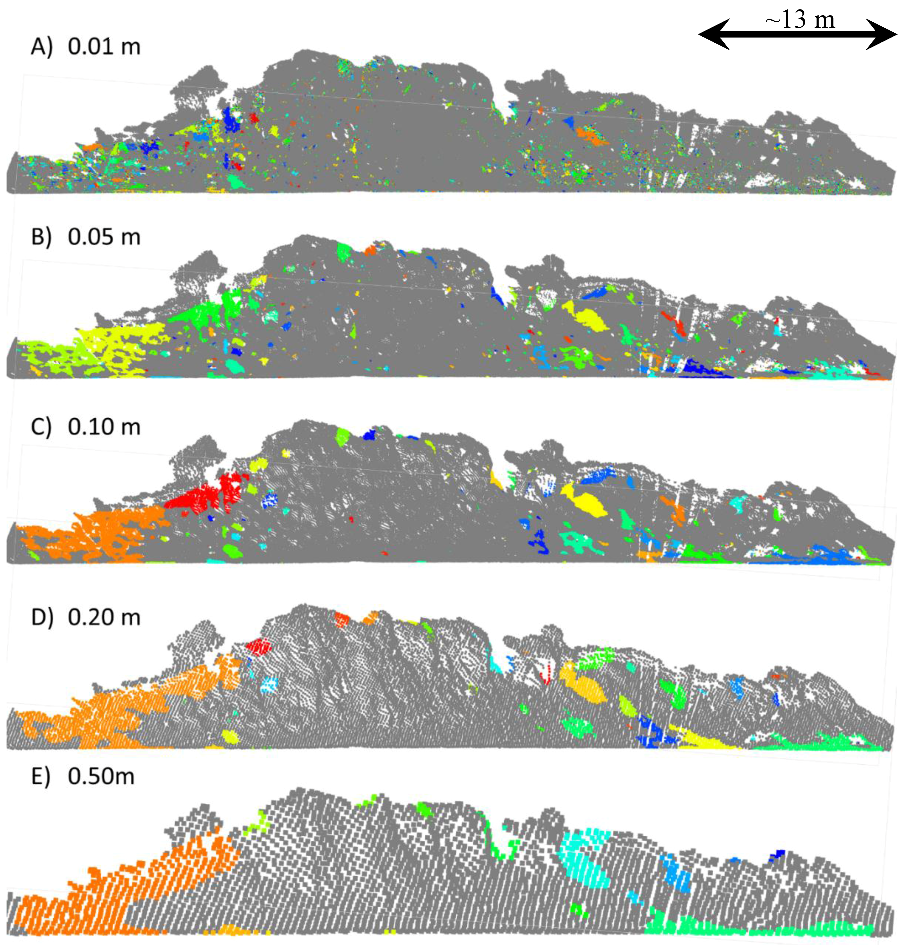 Rockfall clustering results between 2013 and 2014 with varying model resolution including (A) 0.01 m; (B), 0.05 m; (C) 0.10 m; (D) 0.20 m; and (E) 0.50 m for Site A (90 m). The grey indicates portions of the cliff that did not experience significant erosional change. (Note that these sections may have experienced accretion). Larger white sections indicate holes or spacing between centroid points. Other colors represent a rock cluster where material has dislodged from the cliff. Each cluster is given an ID and colored based on that ID with a repeating pattern so that they can be distinguished from one another. For simplicity of rendering, the point cloud was used rather than the surface model.