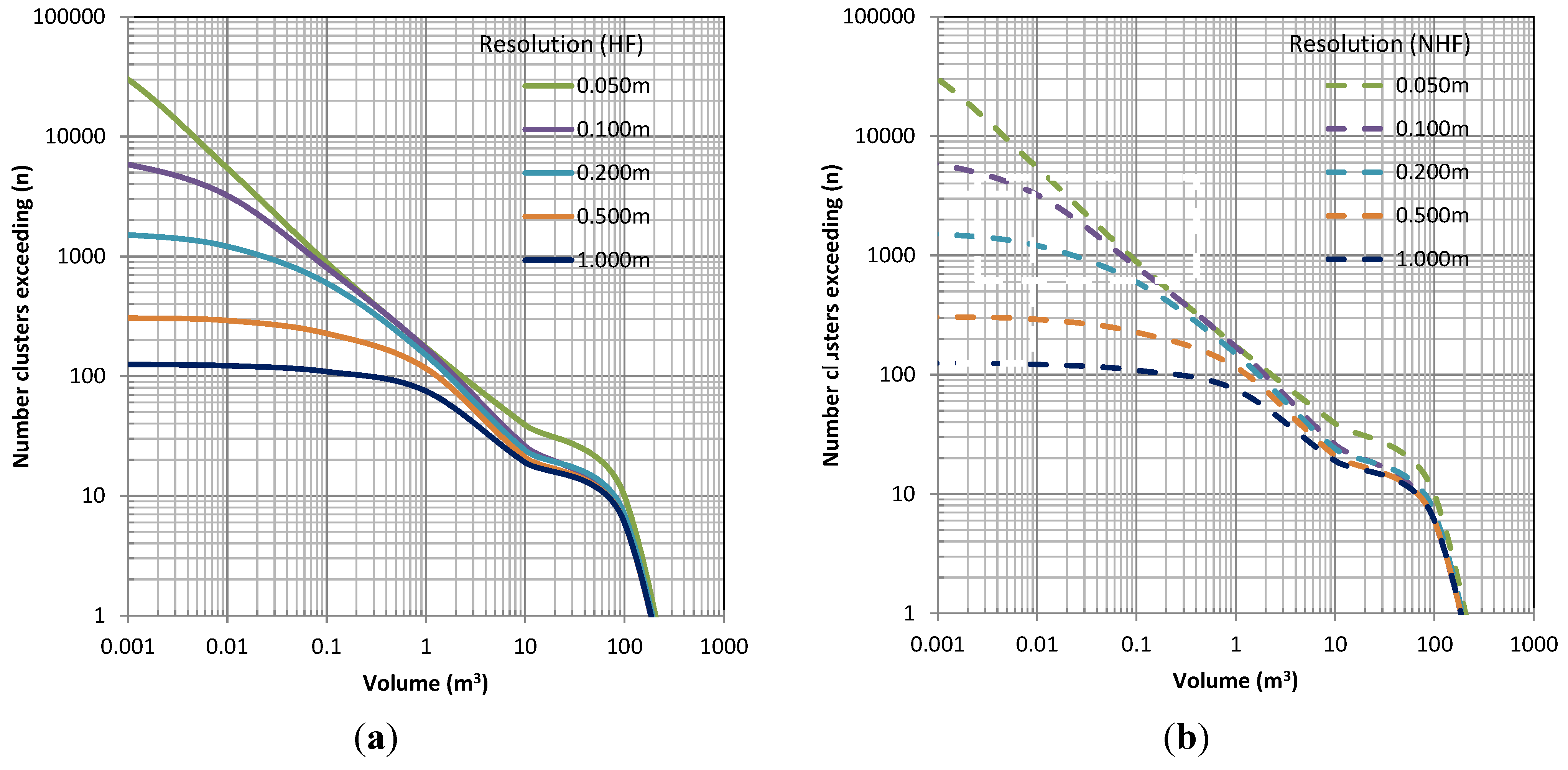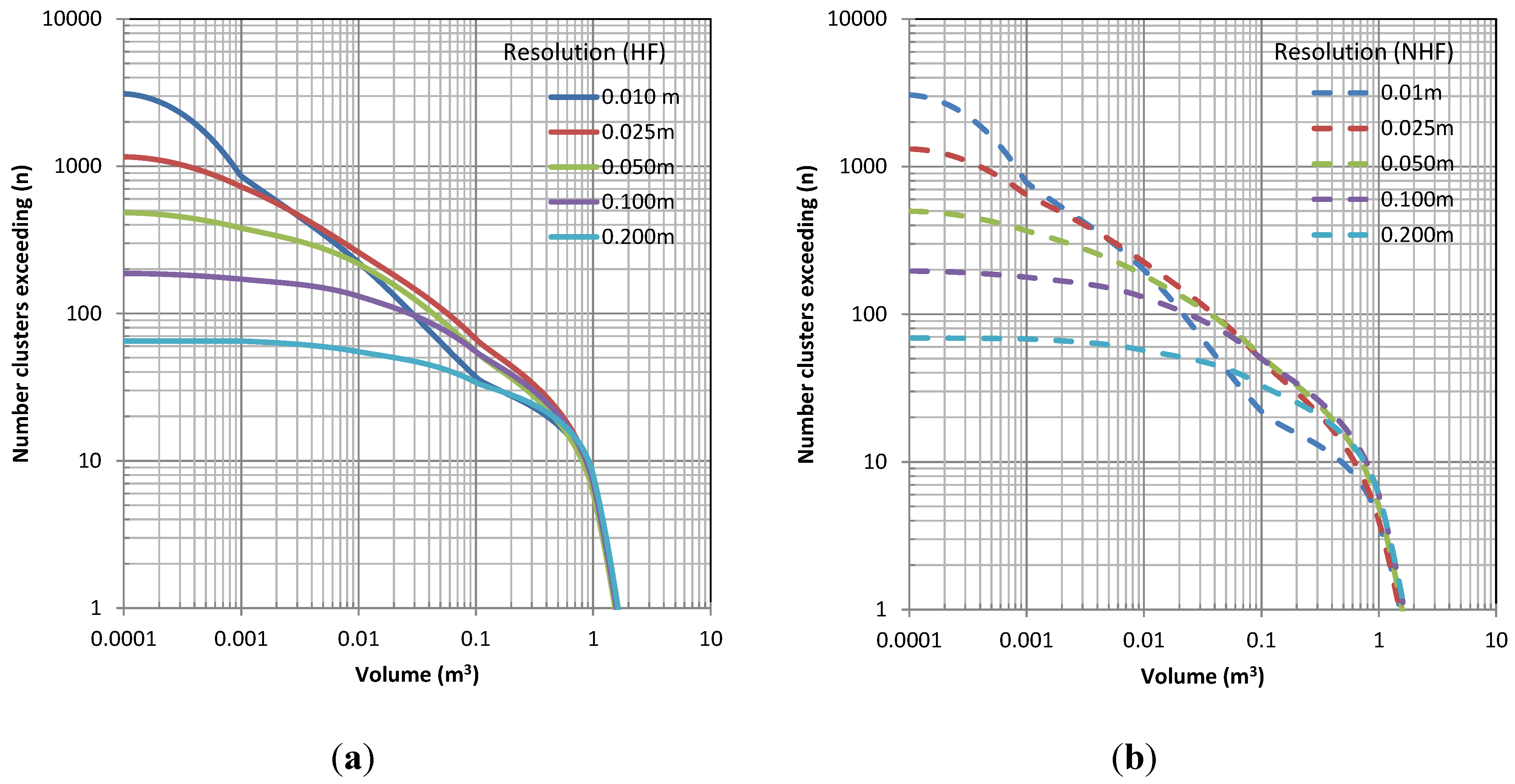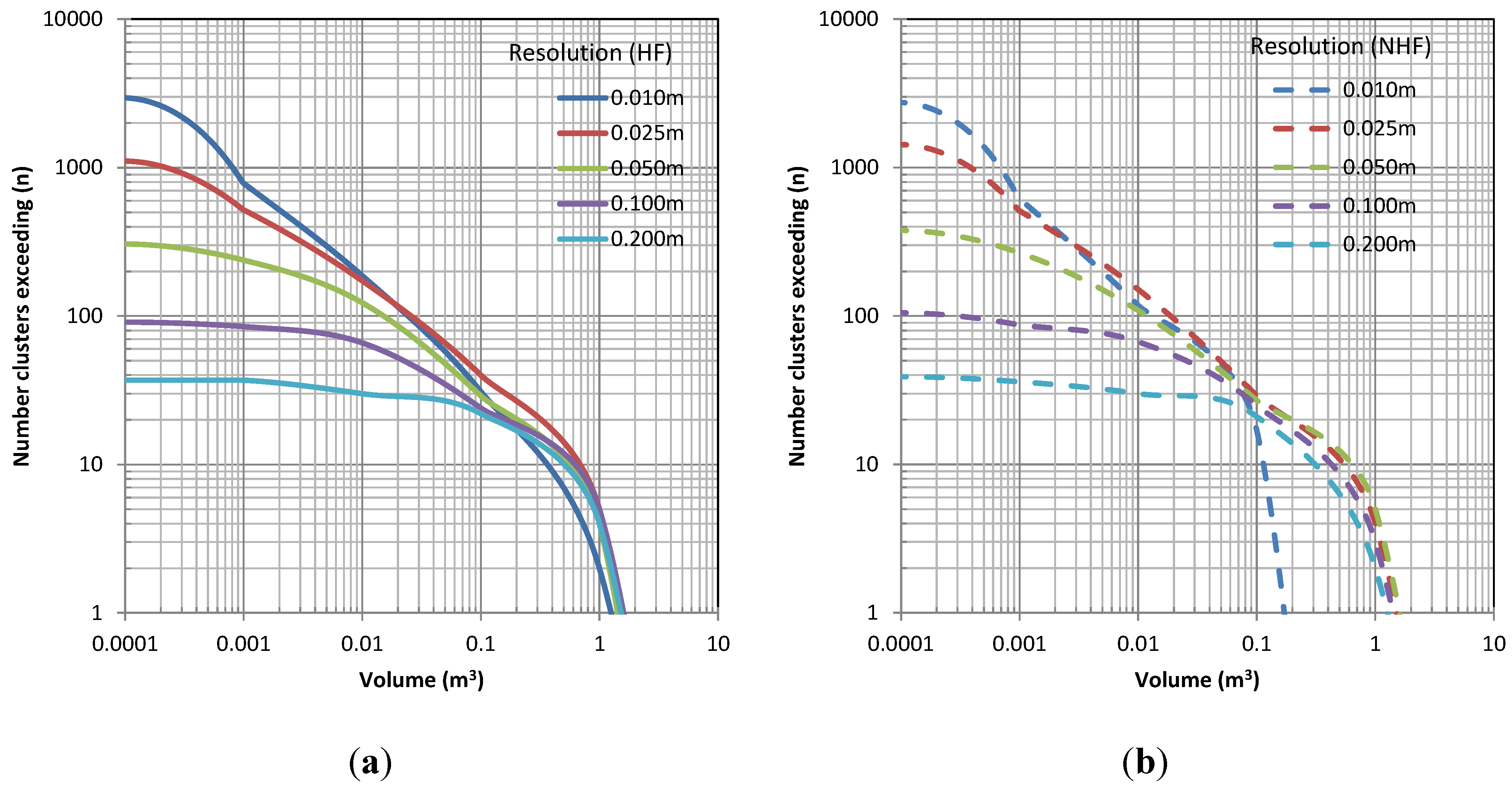 Figure 10, Figure 15 and Figure 20 all show significantly different magnitude–frequency relationships with varied resolution, particularly for detecting smaller volumes. Generally, the relationships are fairly similar for events greater than 0.1 m3. However, at Site A (Figure 10), the 0.01 m model without hole filling was unable to detect those larger events unless holes were filled. The 0.01 m model with holes filled produced a very similar magnitude–frequency relationship to the lower resolution models for volumes >0.01 m3. The 0.01 m model at Site B performed much better.