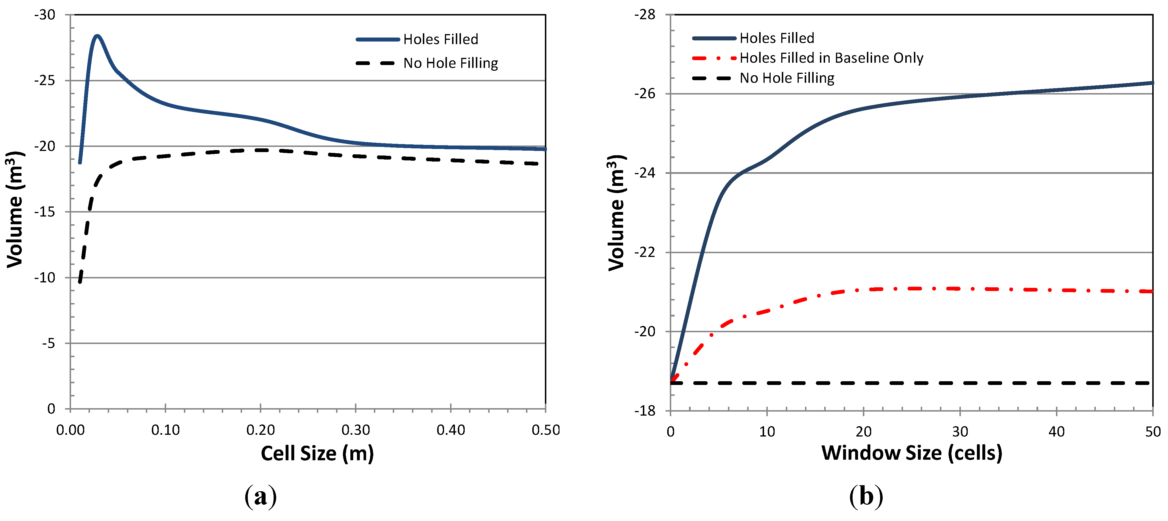 Nonetheless, hole filling by TPS works well for creating realistic surface and the models proved to be consistent with the topography. As evidenced in Figure 10, Figure 15, and Figure 20, there are relatively similar magnitude–frequency relationships for a given resolution whether holes were filled or not. However, hole filling clearly improved the ability to capture larger events that were sometimes split in the models without hole filling. The search window size should be set sufficiently large to ensure most holes are filled to avoid underestimating volumes (Figure 11b and Figure 16b); although, it should be recognized that a large search window will significantly increase computation time.