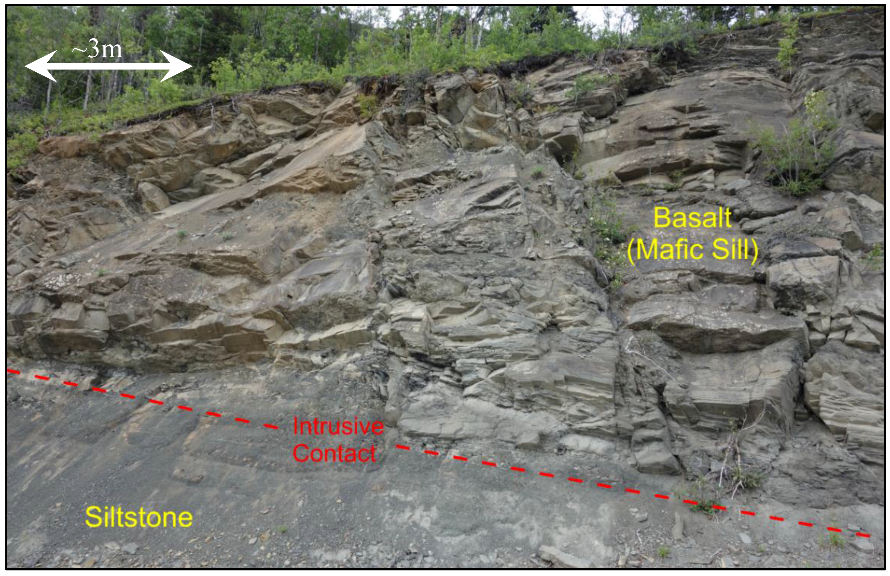 | B | 61.809820°N 148.193481°W | 110 | 11 | 50° | Soft argillaceous rocks (carbonaceous siltstones) of the Chickaloon formation that have been intruded by hard, well-indurated mafic sills (basalt) |